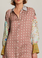 Midi length button up collar dress. Long sleeve with wide contrasting cuffs. Available in all three patterns. You can wear this dress by itself or layer it over pants for a different look. An artistic, versatile piece.