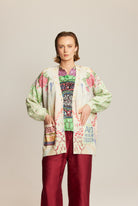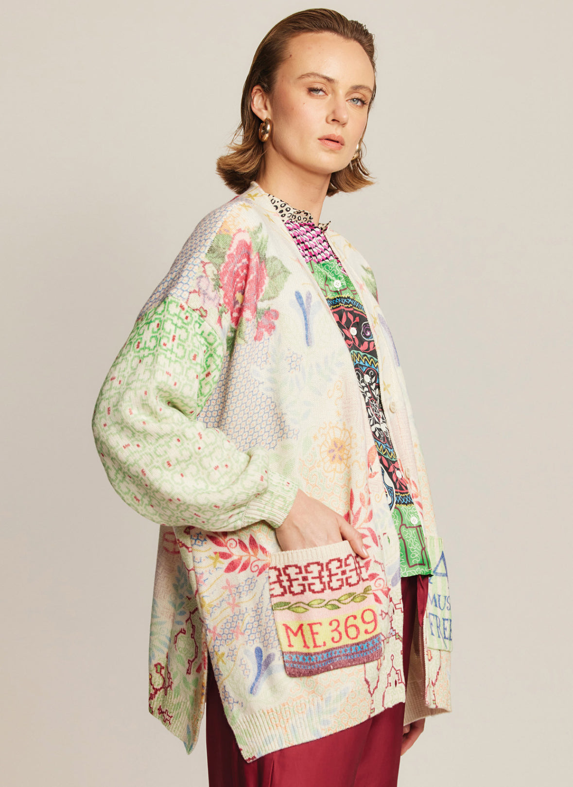 Wool, Acrylic, Nylon Blend. Our Liv long printed cardigan falls just below the hips and comes in all three of our patterns. V-neck, button down with five buttons, long sleeves with cuffs. Two front pockets and short side slits. This sweater is extremely versatile and can be paired with our dresses, pants or skirts for an eye-catching, comfy look.