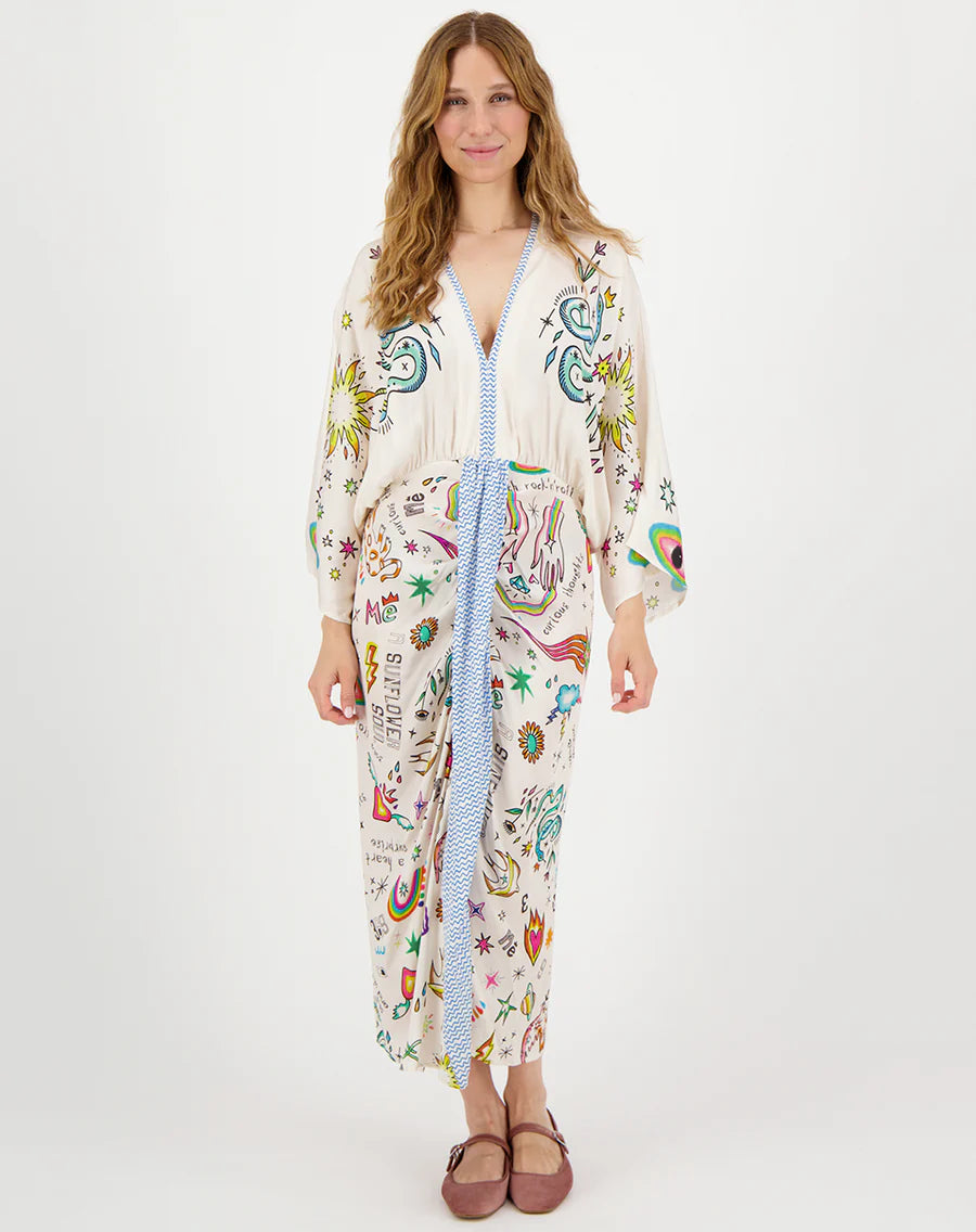 Midi length long, flowy sleeve kimono dress in our Enlightenment pattern. Deep, narrow V-neck, elastic waist and narrow inset in another pattern in front. Very feminine, whimsical look.