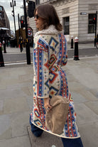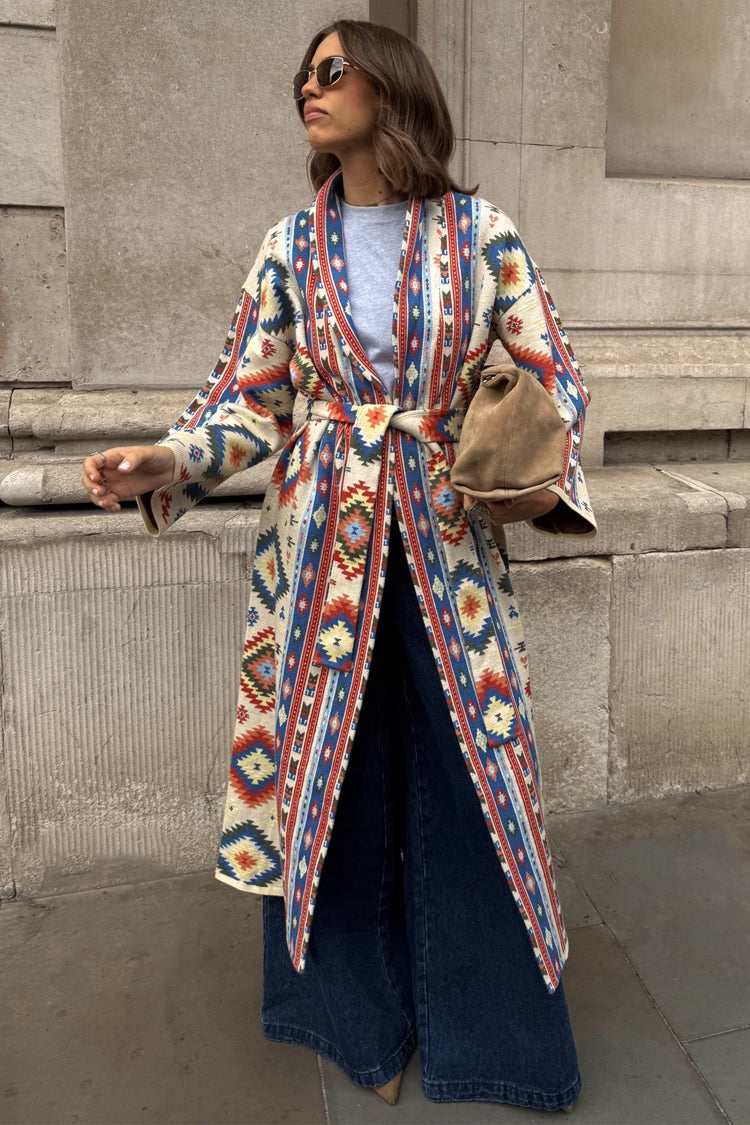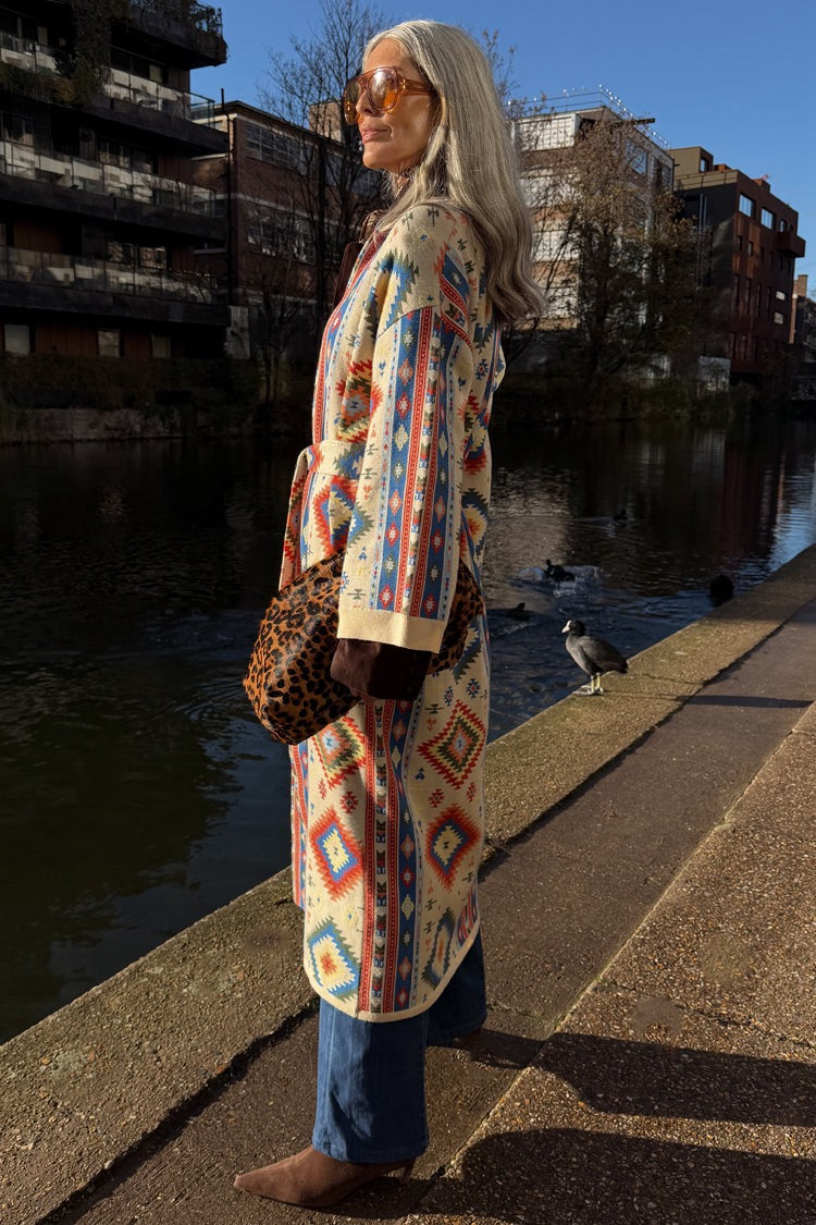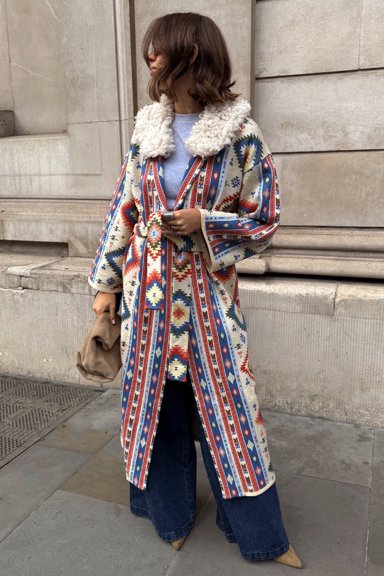 Slightly oversized with dropped shoulders and wide sleeves, it's super cosy and perfect for the transition into the colder seasons. Featuring classic geometric motifs in contrast blue and orange tones that bring a pop of colour to the cream base. Includes a detachable wool collar that allows you to style in a multitude of ways.