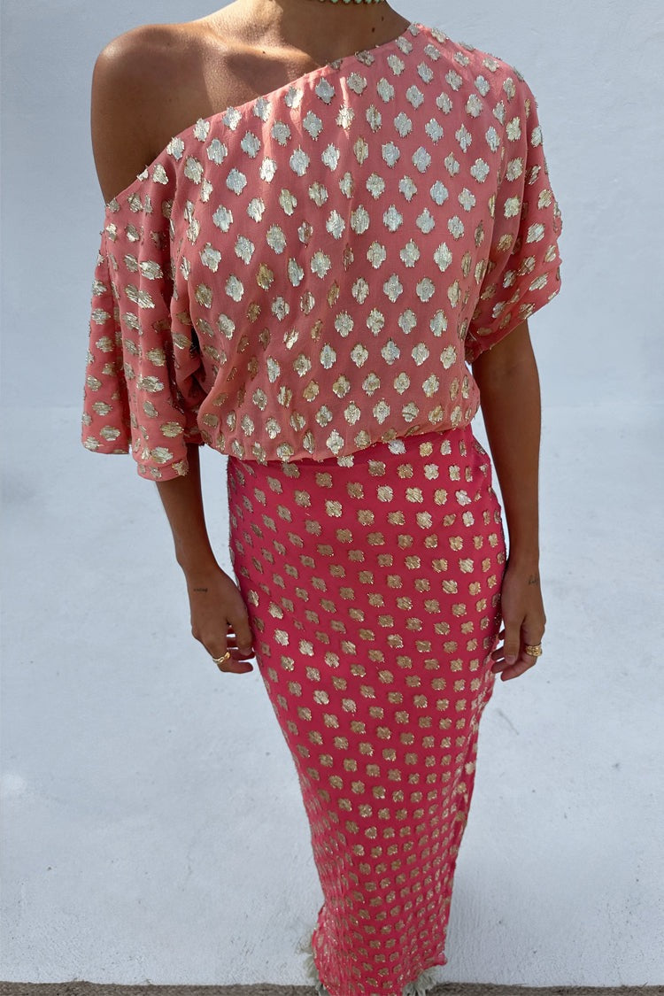 Baring a touch of skin with an effortless off the shoulder silhouette. Our classic tilly silhouette in a new jacquard fabric! In a contrast pink and red colourway, flecked with sparkling gold dots with an elasticated waist seam for a comfortable fit and definition on the figure!