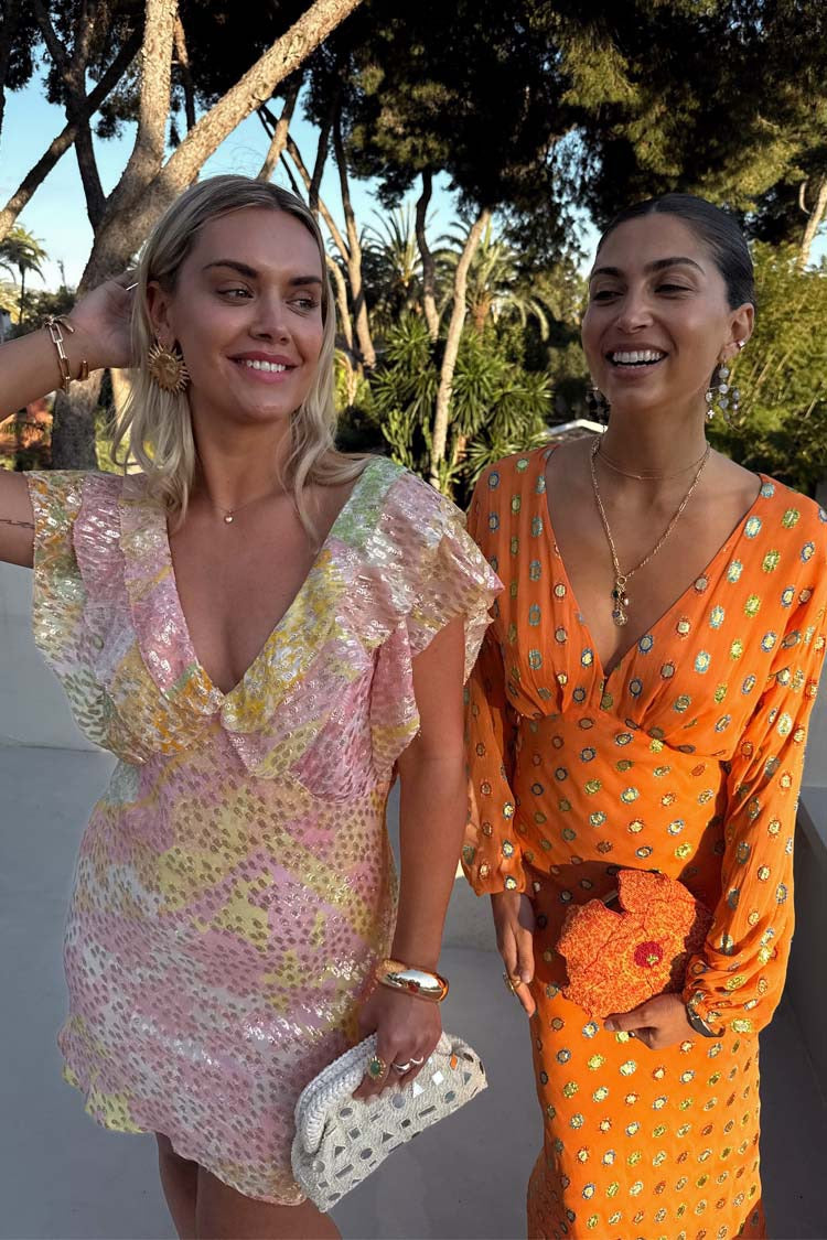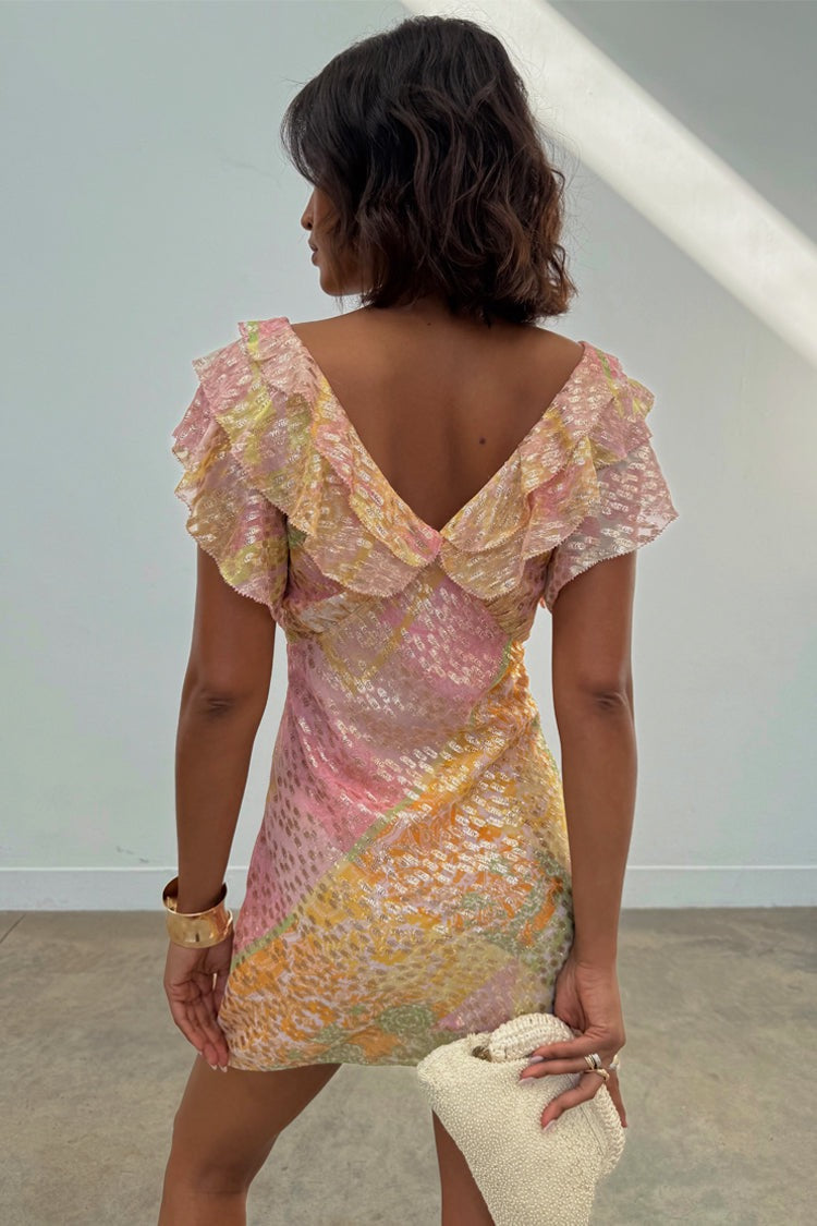 The pink, yellow and green tones and gold fleck detailing add a splash of NFD colour to your spring/summer wardrobe! The lightweight breathable fabric, paired with the deep v neckline and ruffle detailing make this dress the perfect wedding guest attire. Keep it simple with some heels and a clutch for effortless styling.