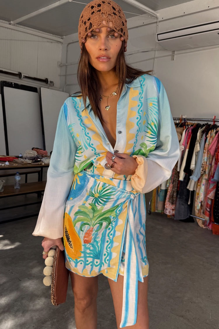 Our best-selling Miley shirt in a lightweight, breathable fabric, perfect for trans-seasonal styling. The Rio print combines iconic NFD motifs with a range of tropical fruits that are hand-painted and designed in-house by our amazing design team! With elasticated cuffs and tortoise shell buttons. All of the pieces in this collection are true injections of feel good dressing for your SS25 wardrobe.