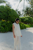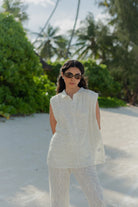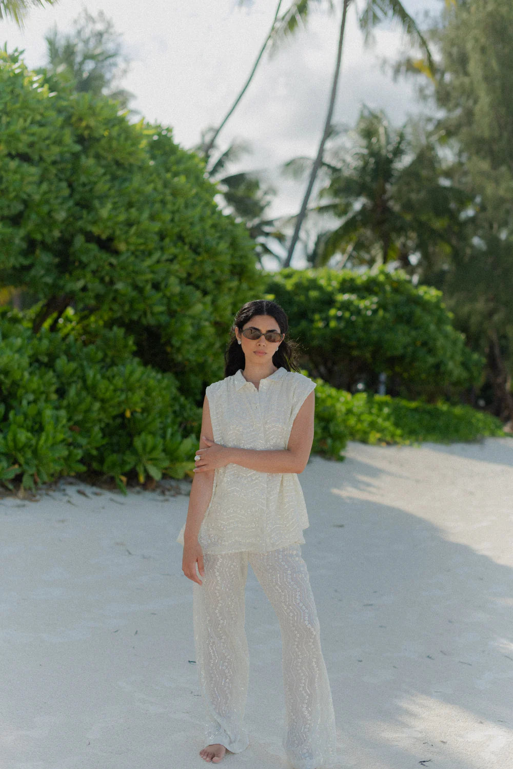 Made in a delicate embroidered fabric with textured geometric patterns that shimmer beautifully under the sun, Coquelicot pant with Assia blouse is an iconic effortless set. Coquelicot pant is a light and flared pant with an elastic at the waist. Pair it with the match Assia blouse or wear it on your beachwear for a relaxed fit.
