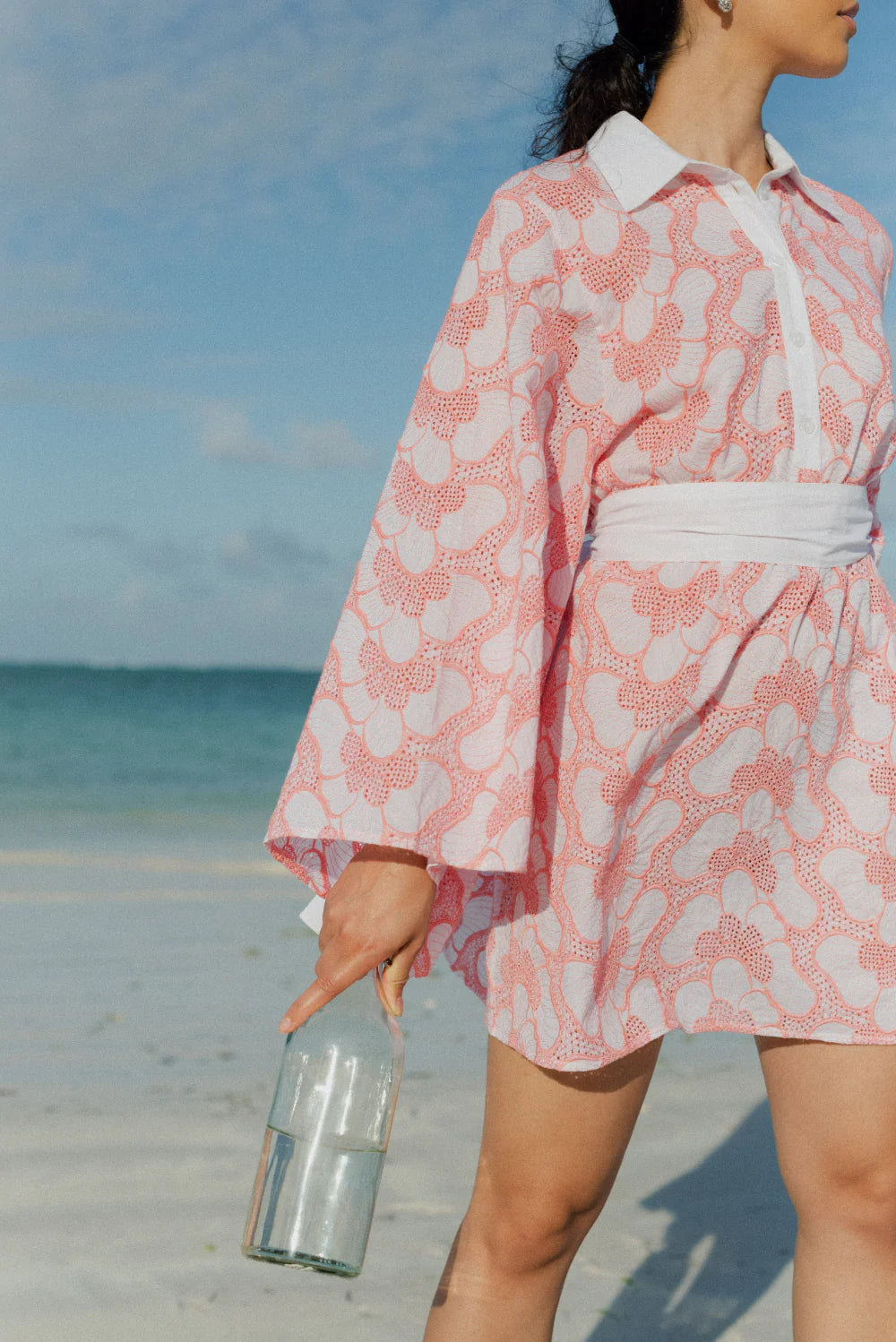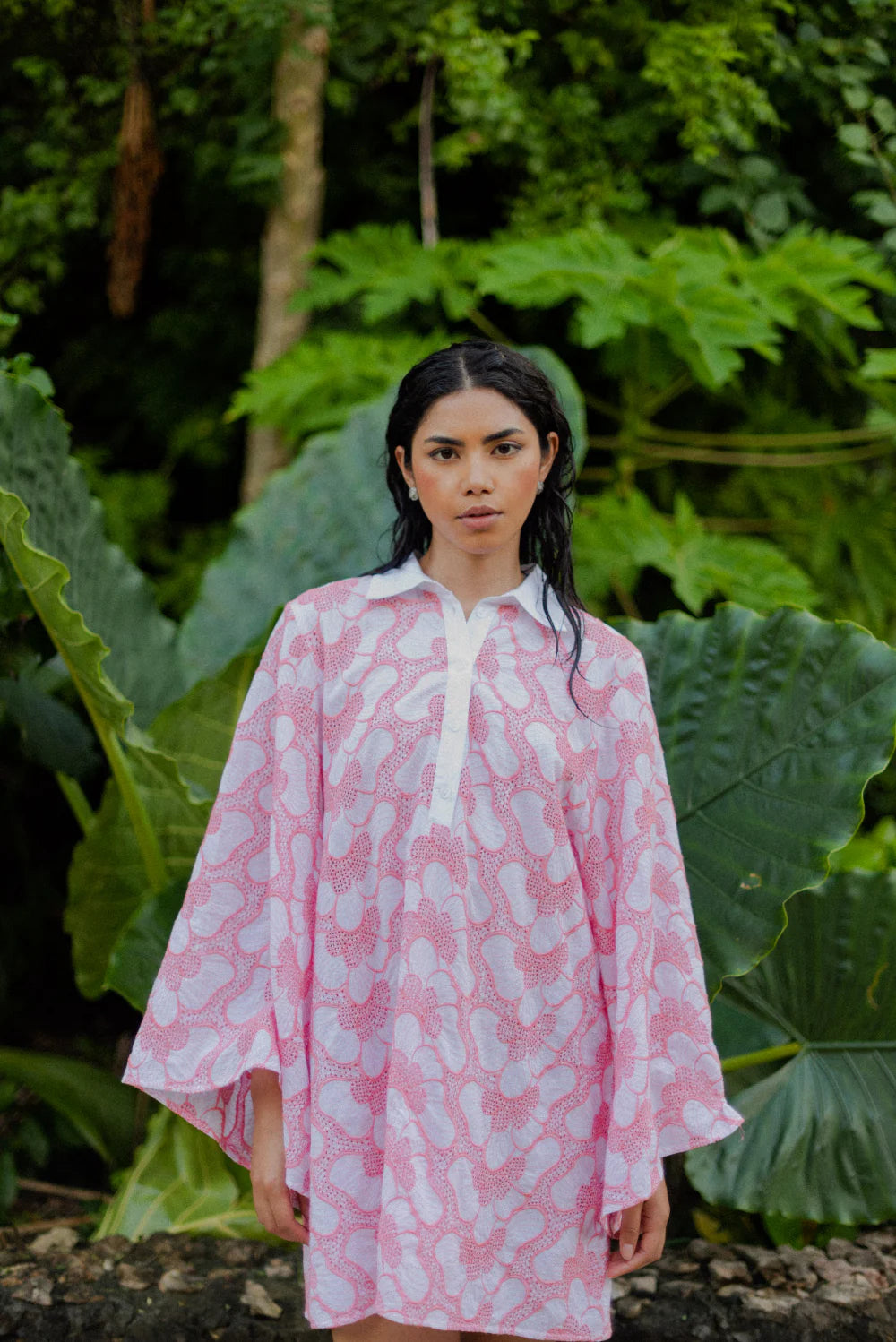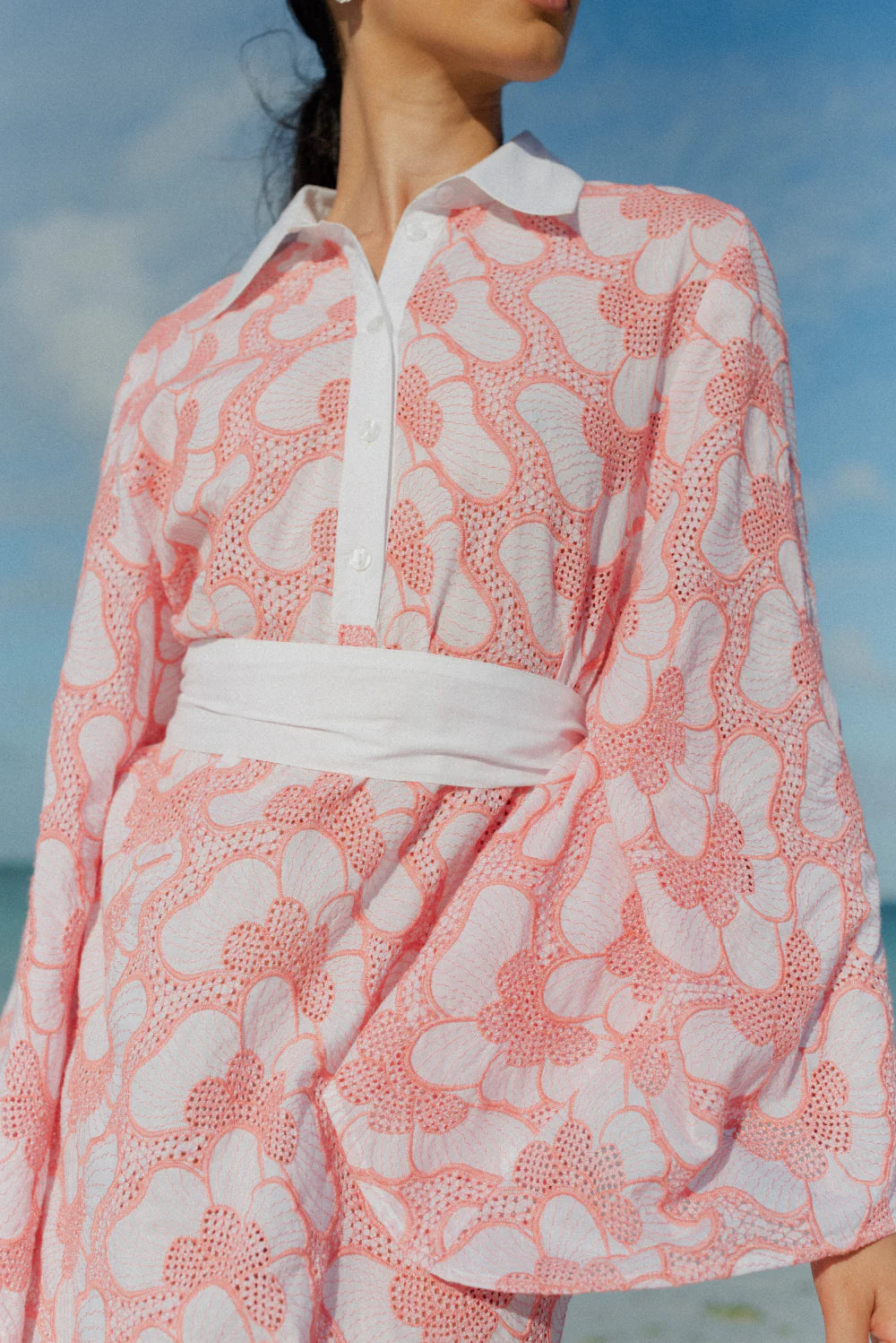 Made in beautiful eyelet highlighted by a pink topstiching, Lupy is a perfect summer dress that can be worn in city as on the beach. It has a V neckline adorned by a buttonhole and a little collar. Flared long sleeves bring lightness to movements.