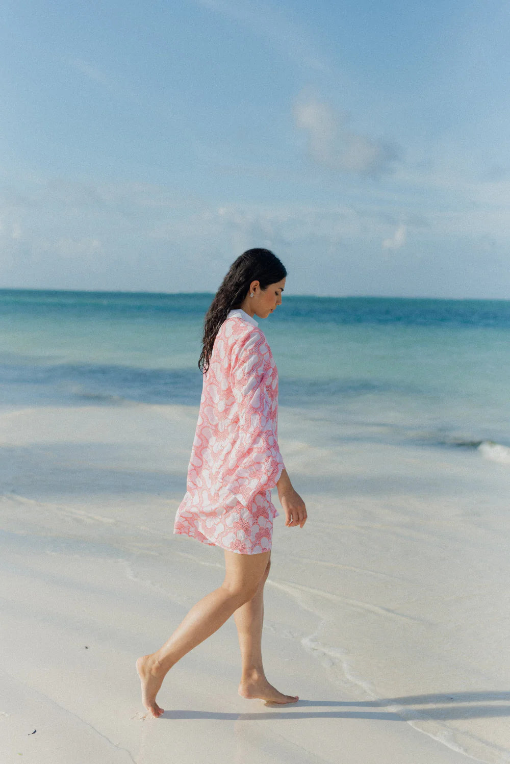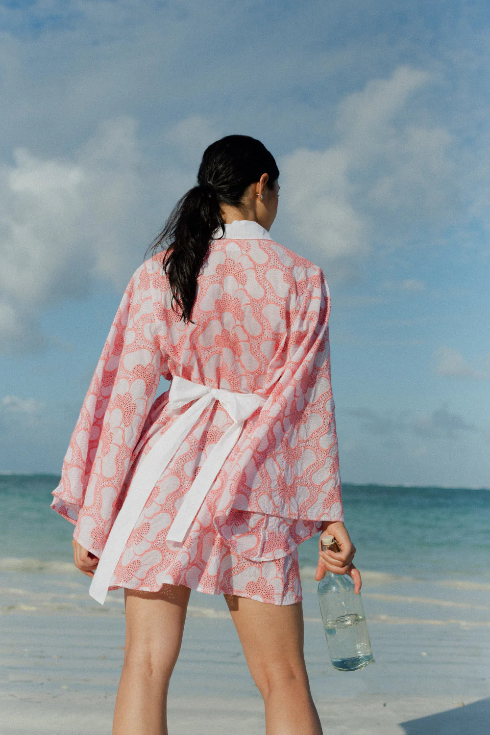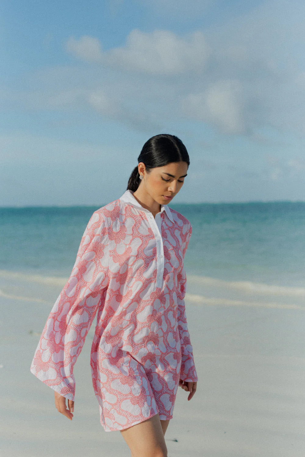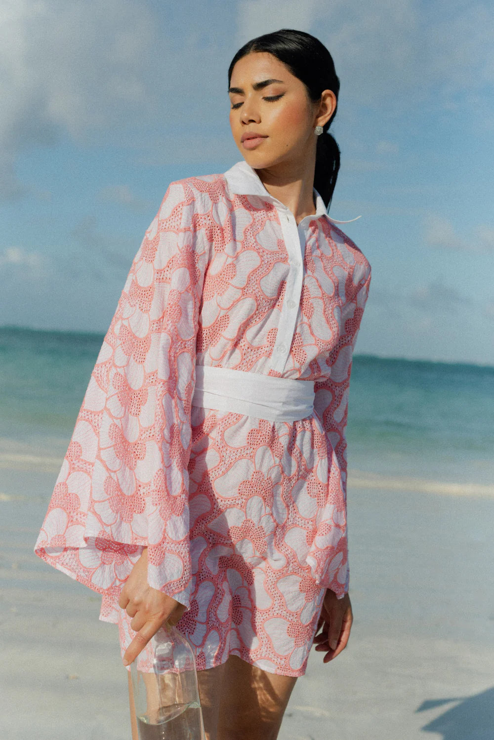 Made in beautiful eyelet highlighted by a pink topstiching, Lupy is a perfect summer dress that can be worn in city as on the beach. It has a V neckline adorned by a buttonhole and a little collar. Flared long sleeves bring lightness to movements.