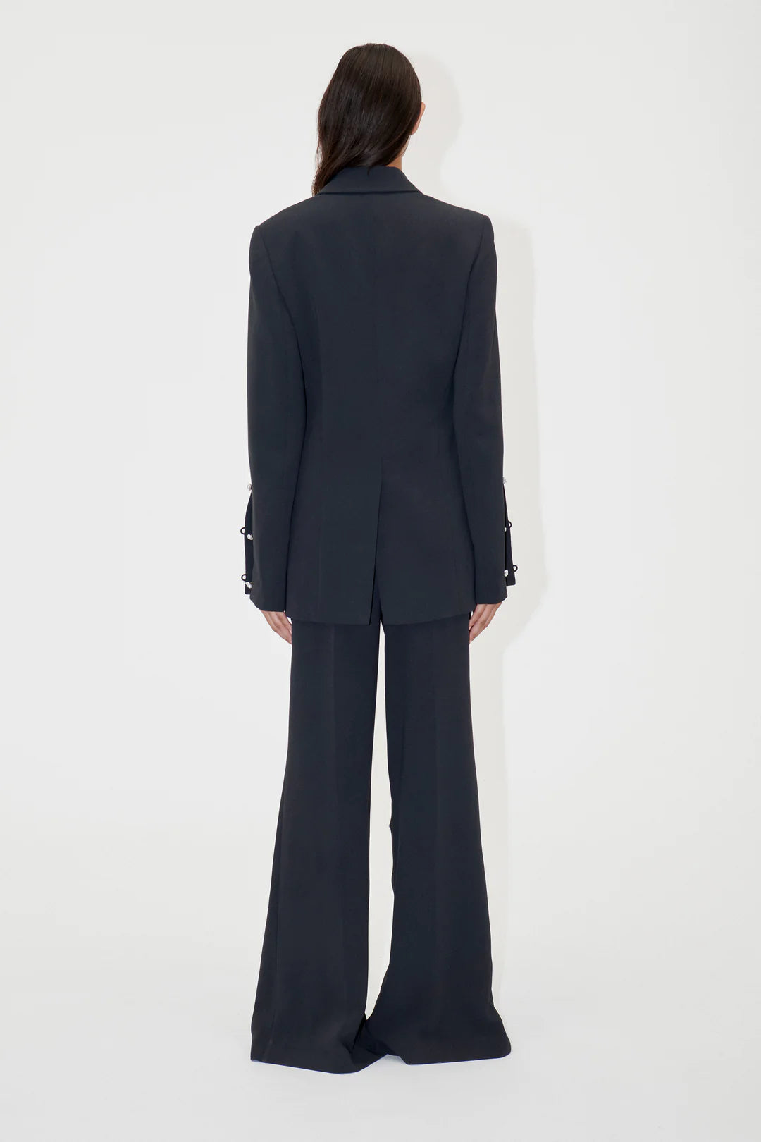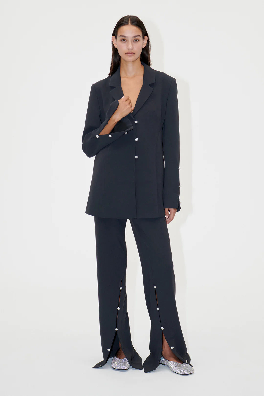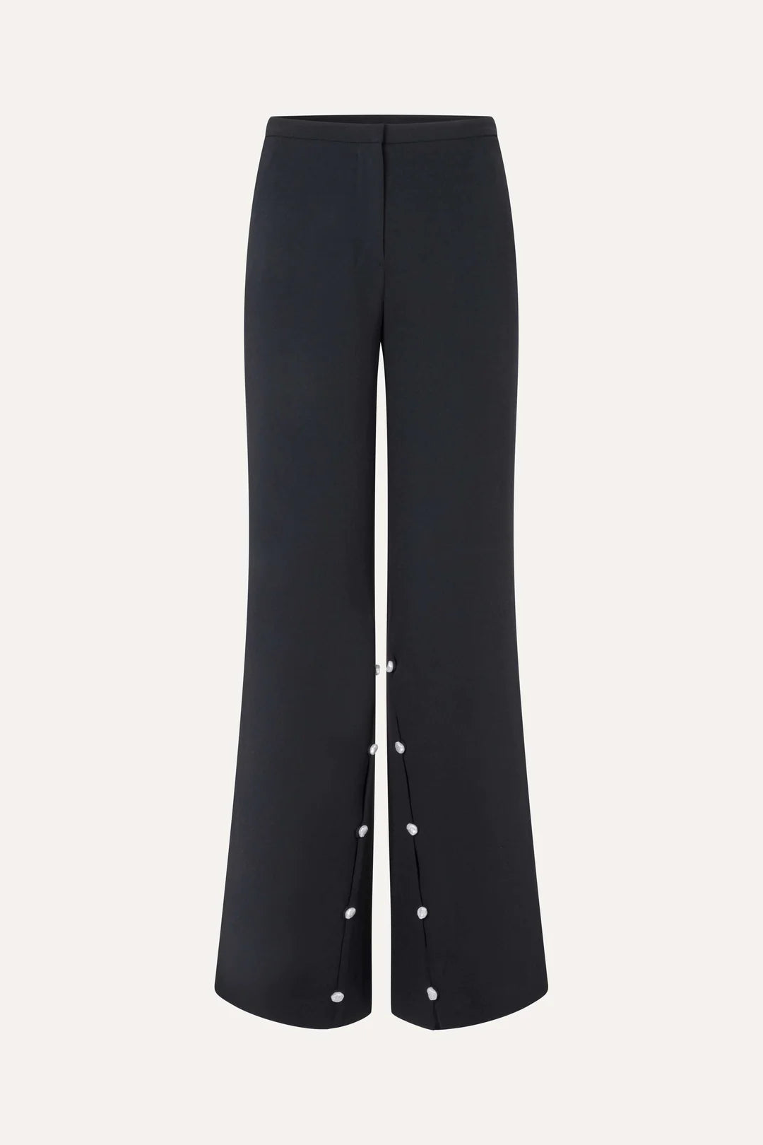LOOSE FITTING HIGHWAIST PANTS WITH A WIDE LEG AND TWISTING SLITS WITH PEARL BUTTON DETAIL. 100% RECYCLED POLYAMIDE. FULLY LINED. PAIR WITH THE SGRORY JACKET IN JET BLACK AND THE SGREELO SHOES IN JET BLACK EMBROIDERY.