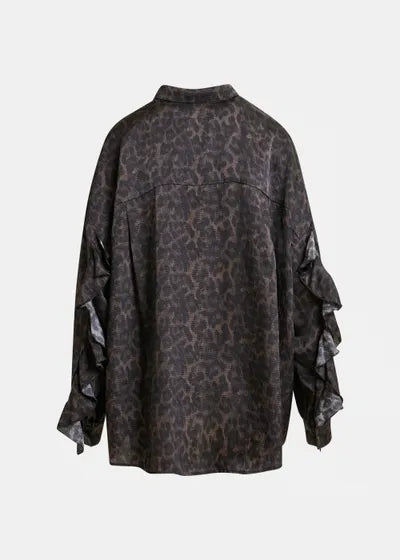 Leopardprint shirt is designed for an oversized fit with dropped shoulders for a relaxed silhouette. It features a classic button fastening through the front, a single chest pocket, and statement ruffle detailing along the sleeve seams that adds volume and movement.
