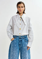 Essentiel Antwerp JOMATO Off-white, black and light blue striped cotton shirt with elongated collar and mismatched buttons