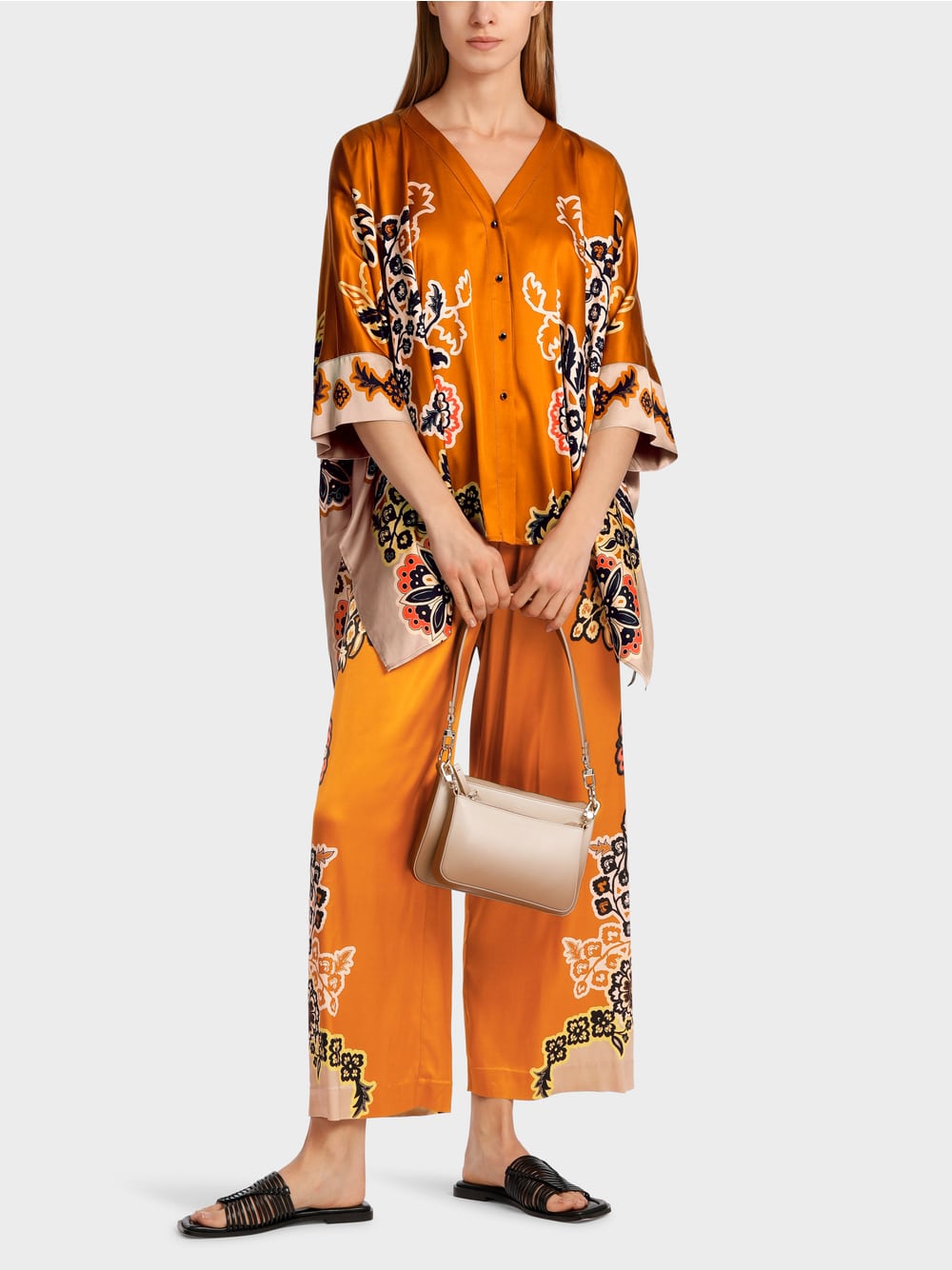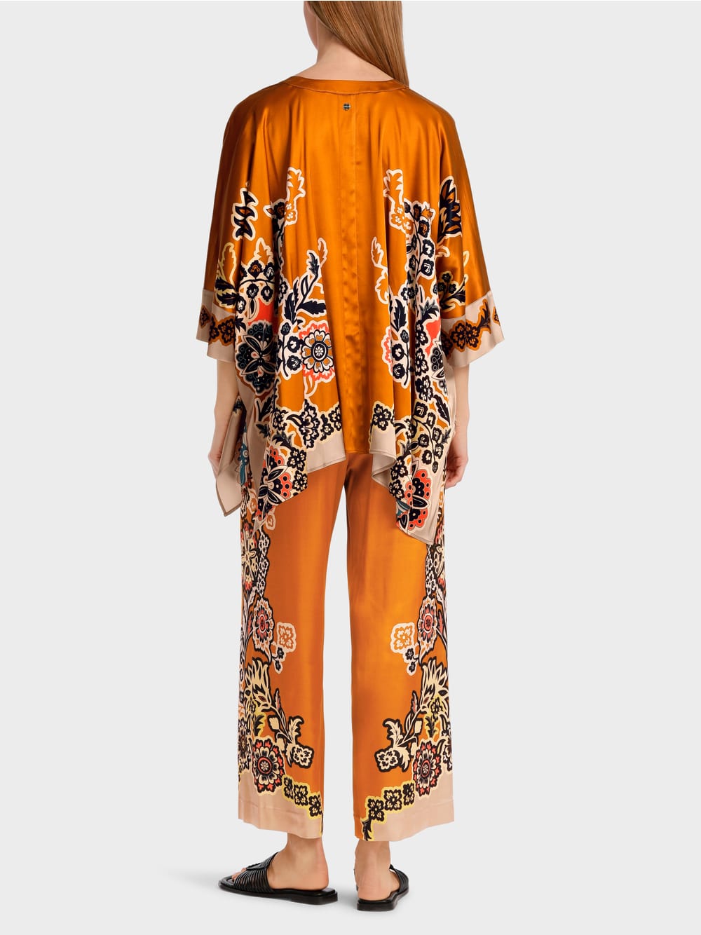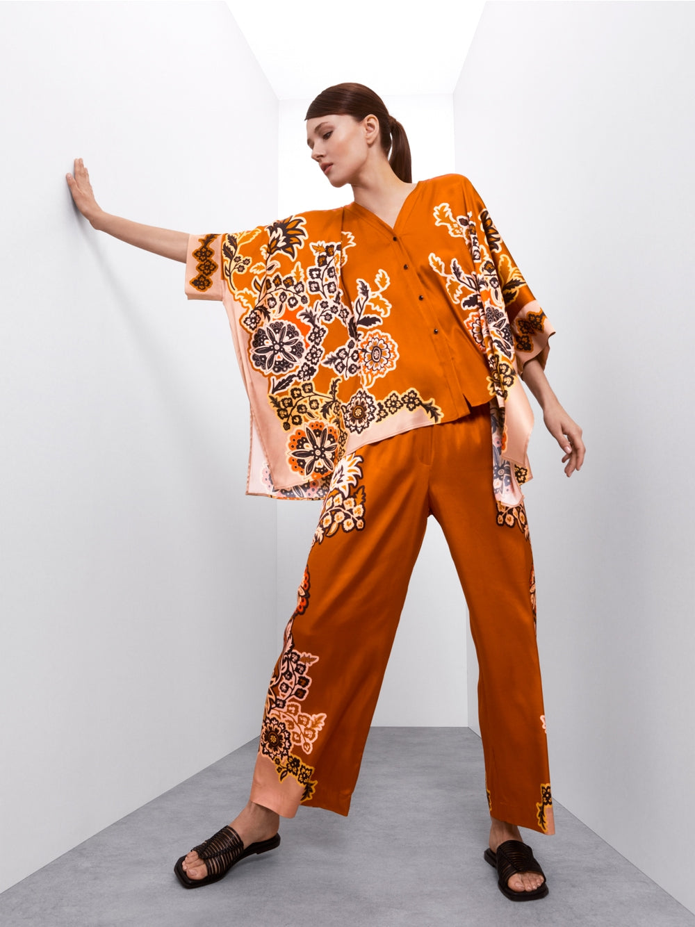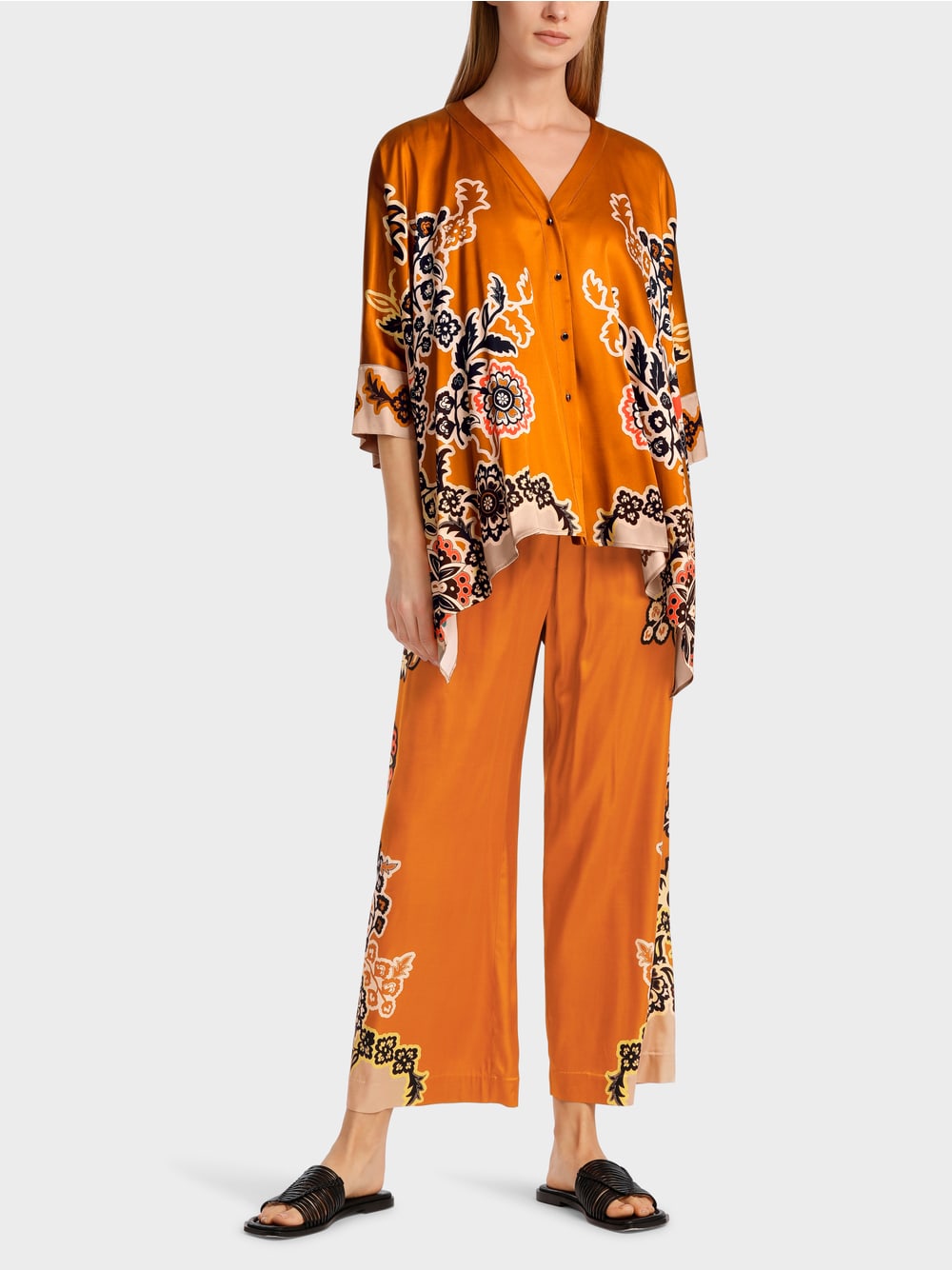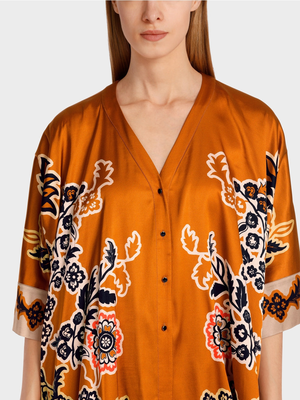 The blouse has a rectangular shape and small, also rectangular sleeves. The V-neck and button placket are functional details. Viscose transforms the geometric shape into a softly flowing silhouette. The print motif is inspired by oriental plant ornaments.