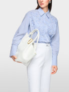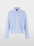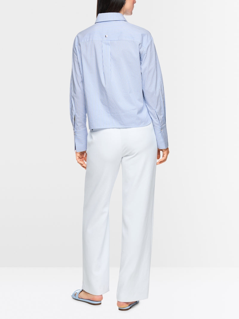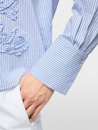 The vertically striped blouse features a classic shirt collar and concealed buttoning – modern, casual and versatile. Its dropped shoulders and wide cuffs give the design an elegant looseness. The quilted ribbons in a floral arrangement are a particular eye-catcher, giving the look a feminine and individual touch. A stylish statement piece for many occasions.