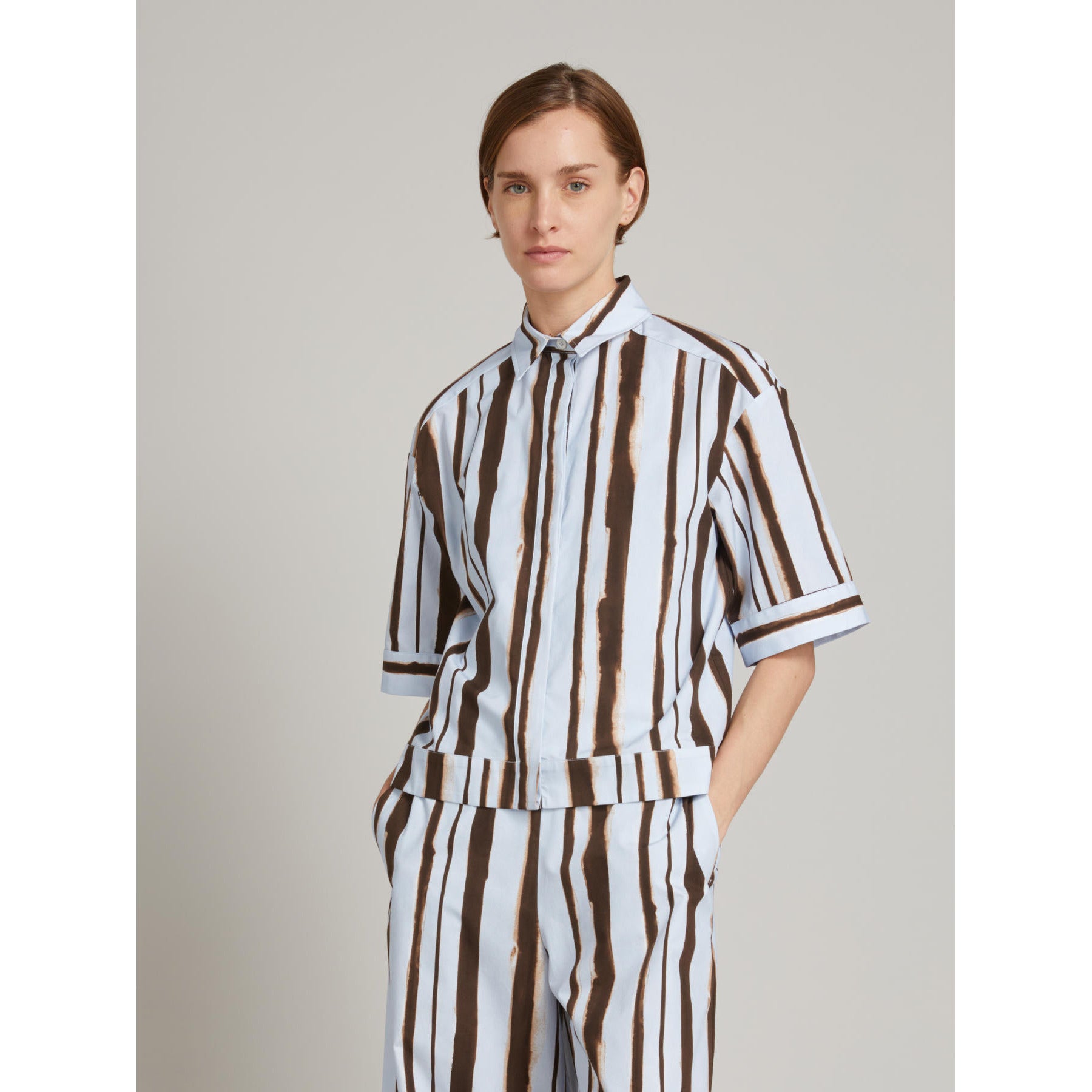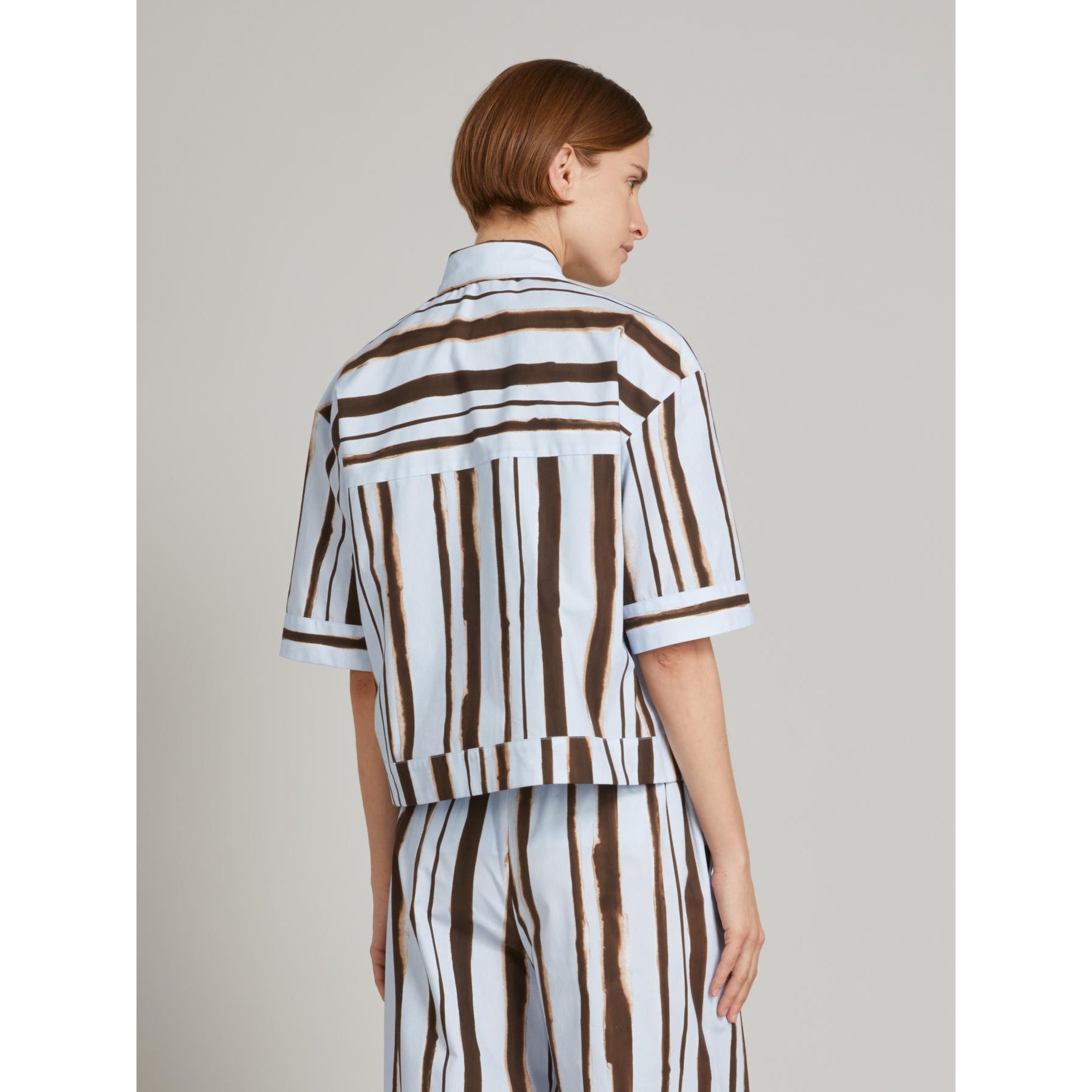 Short-sleeved cropped shirt featuring an all-over signature collection print.