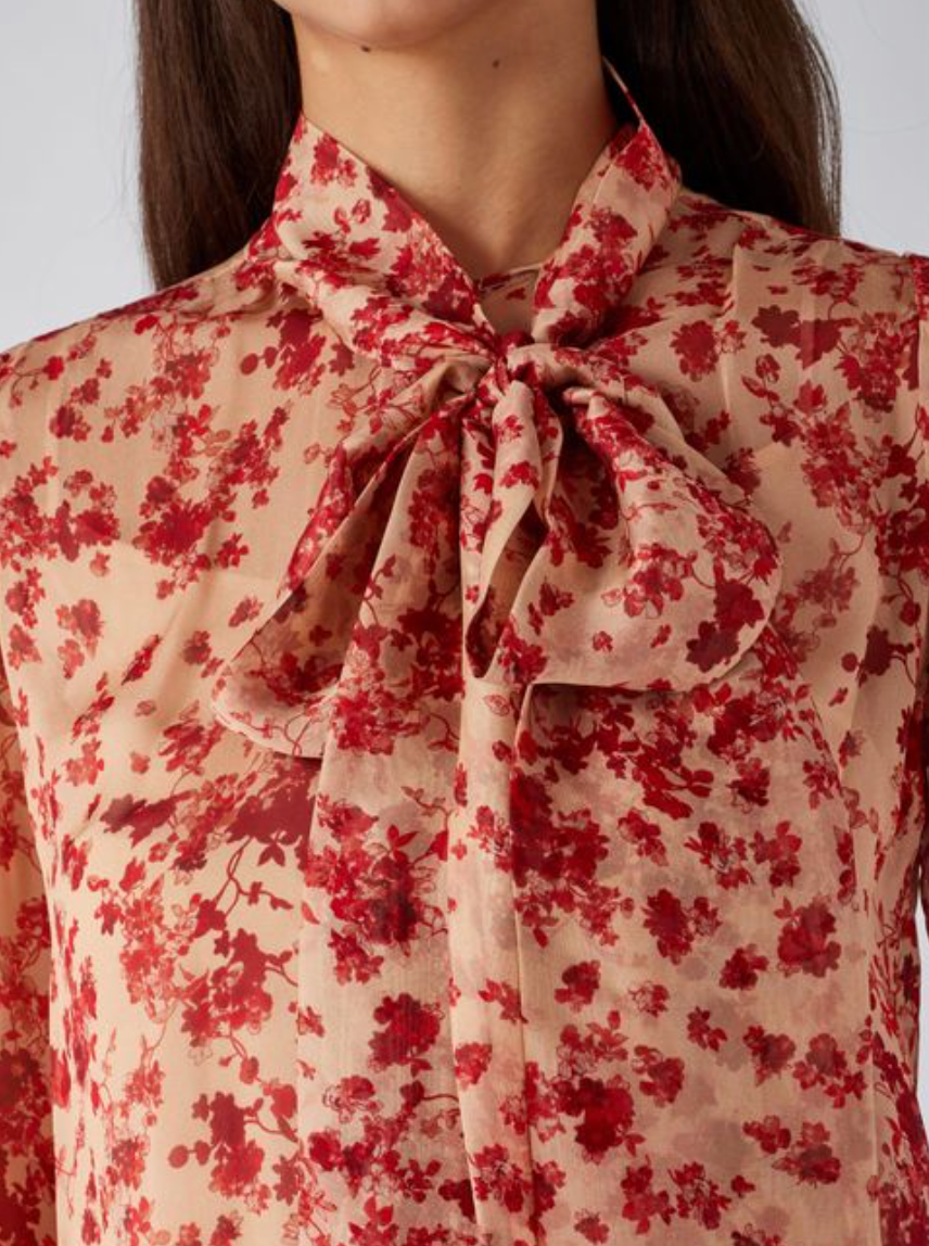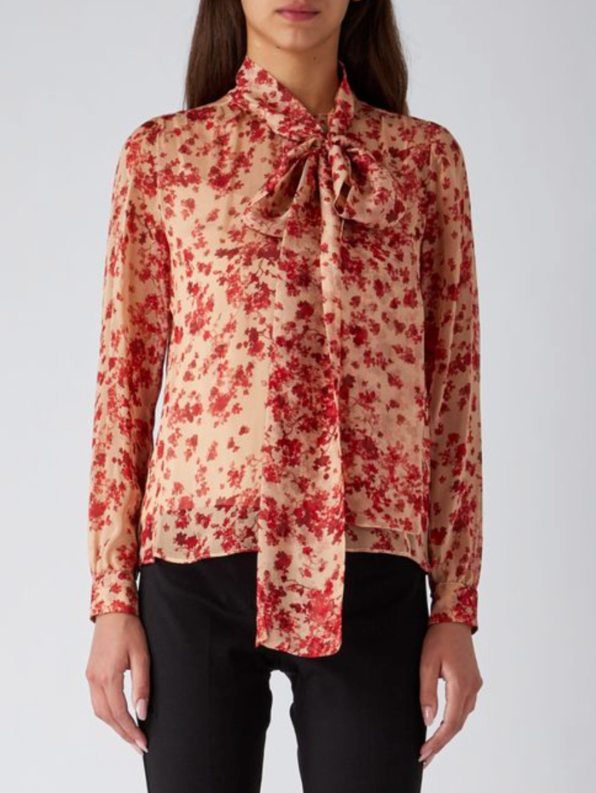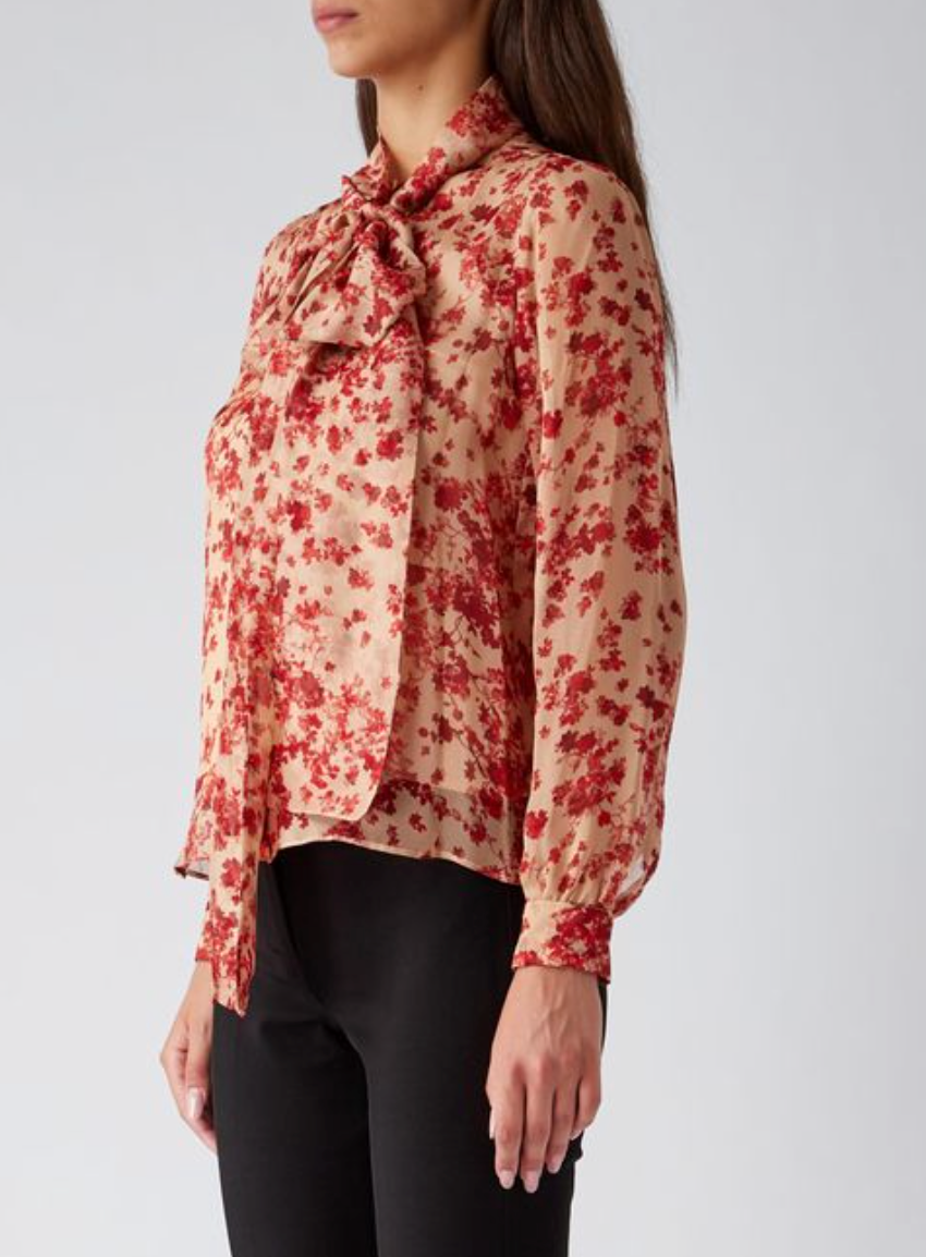 Elegant shirt in a printed, light, pure silk chiffon, characterised by a flowing line with a sash to tie at the neck and a hidden fastening. The style is completed by a delicate draped motif on the shoulders, a yoke that gives structure to the garment and a matching camisole.