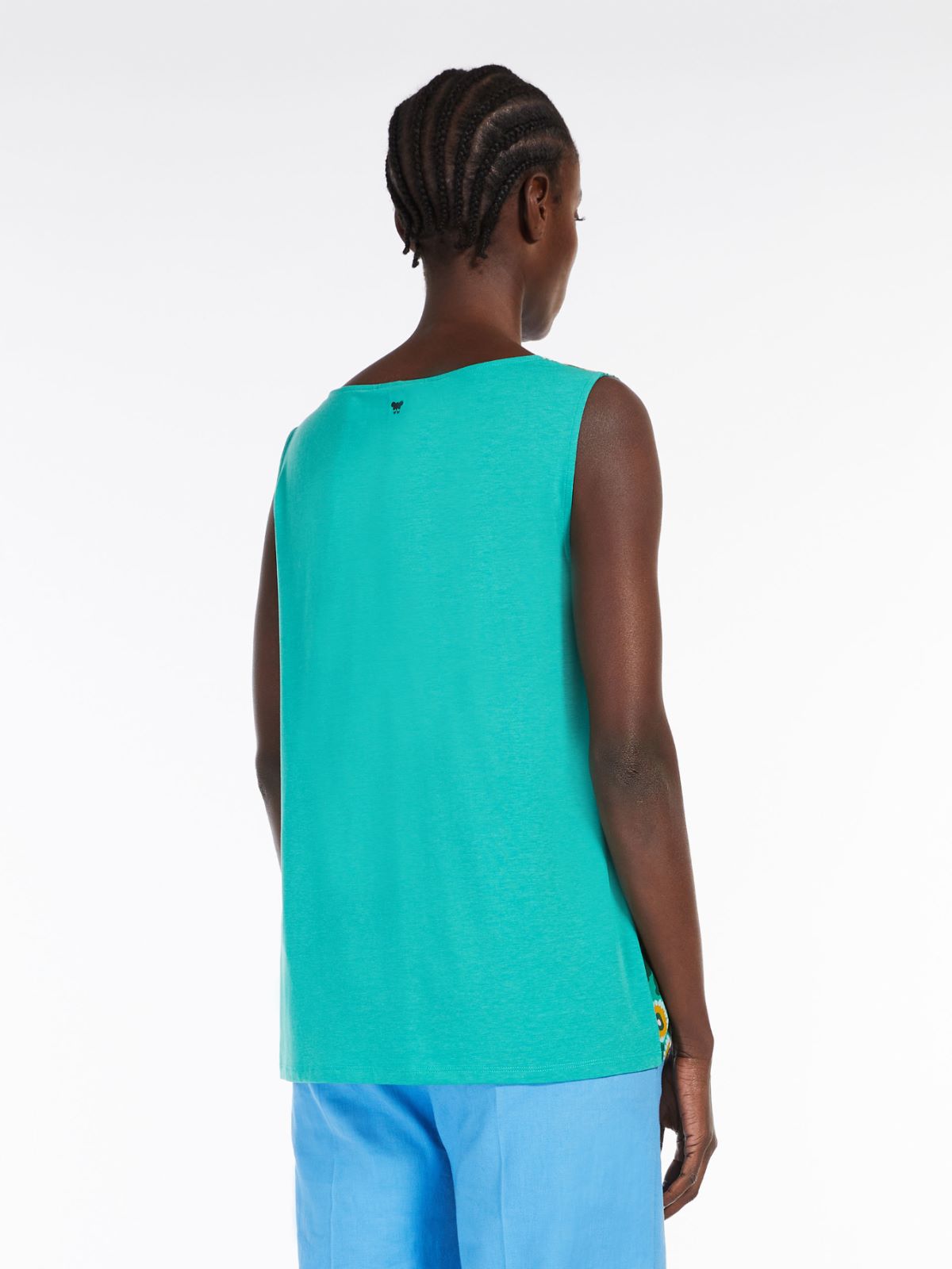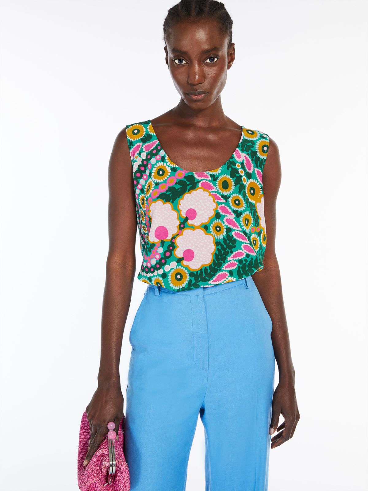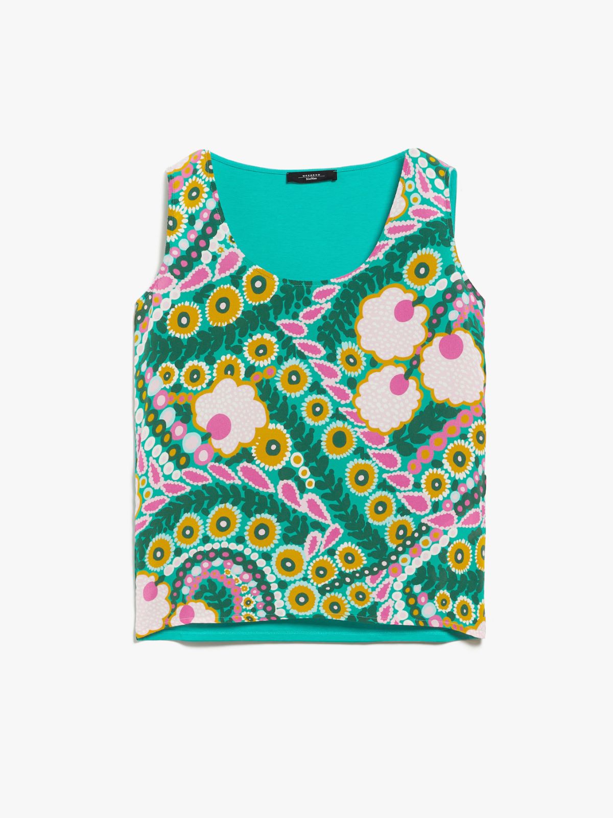 Sleeveless top featuring a printed pure silk crepe de chine front and cotton-blend jersey back. Relaxed-fit garment with a wide round neckline.