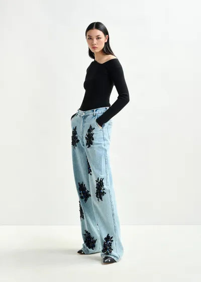 Essentiel Antwerp Black Embellished & Blue Denim Wide Leg Jeans