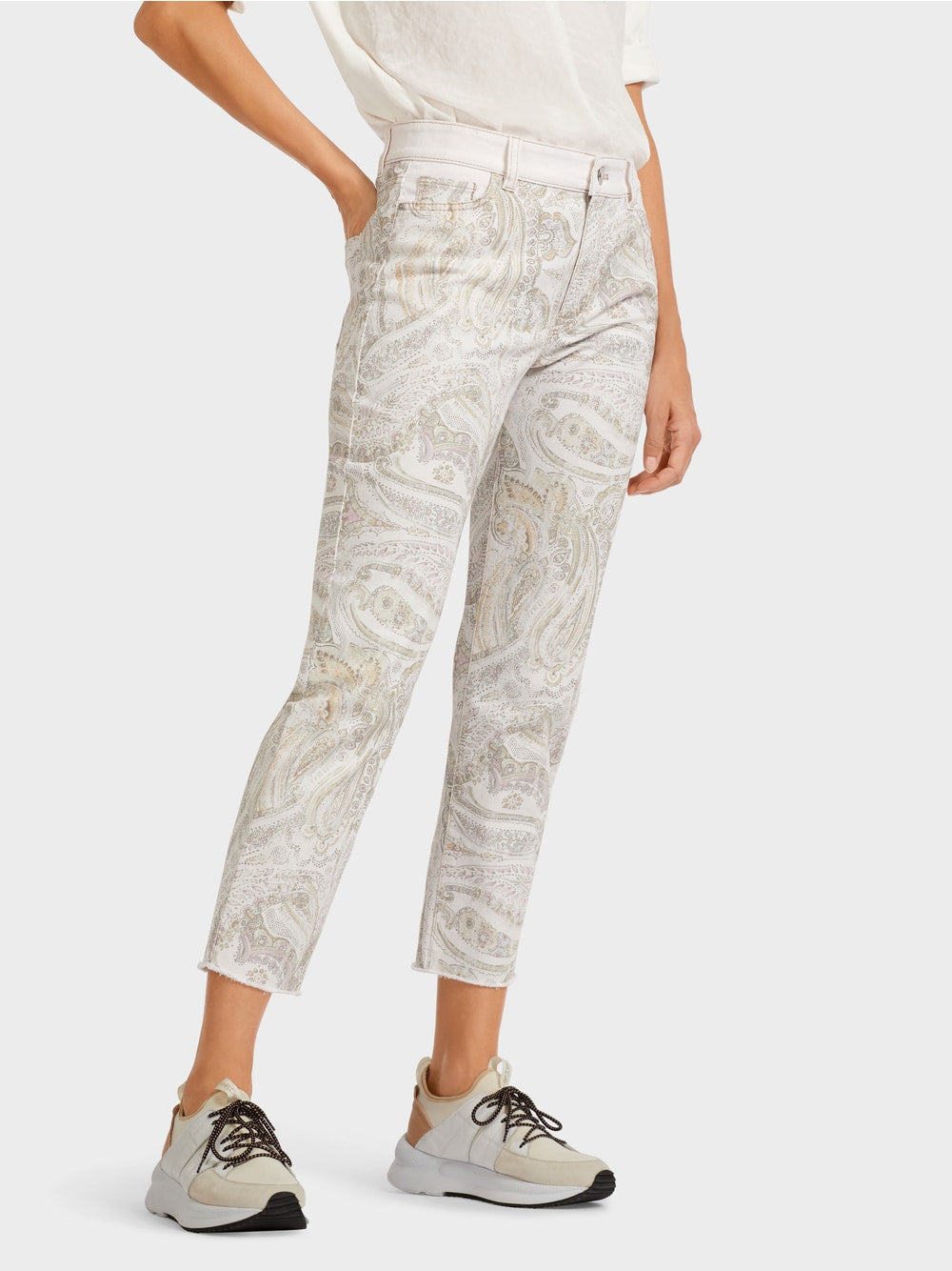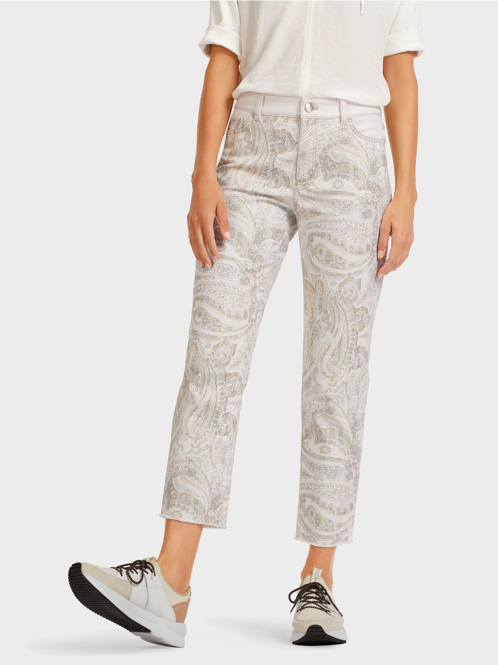 Five-pocket jeans with all-over print. The jeans come in a loose fitting design with a tapered leg. The seat is finished with a saddle detail. The M of the Marc Cain logo is printed on the left seat pocket. The waistband is plain coloured.