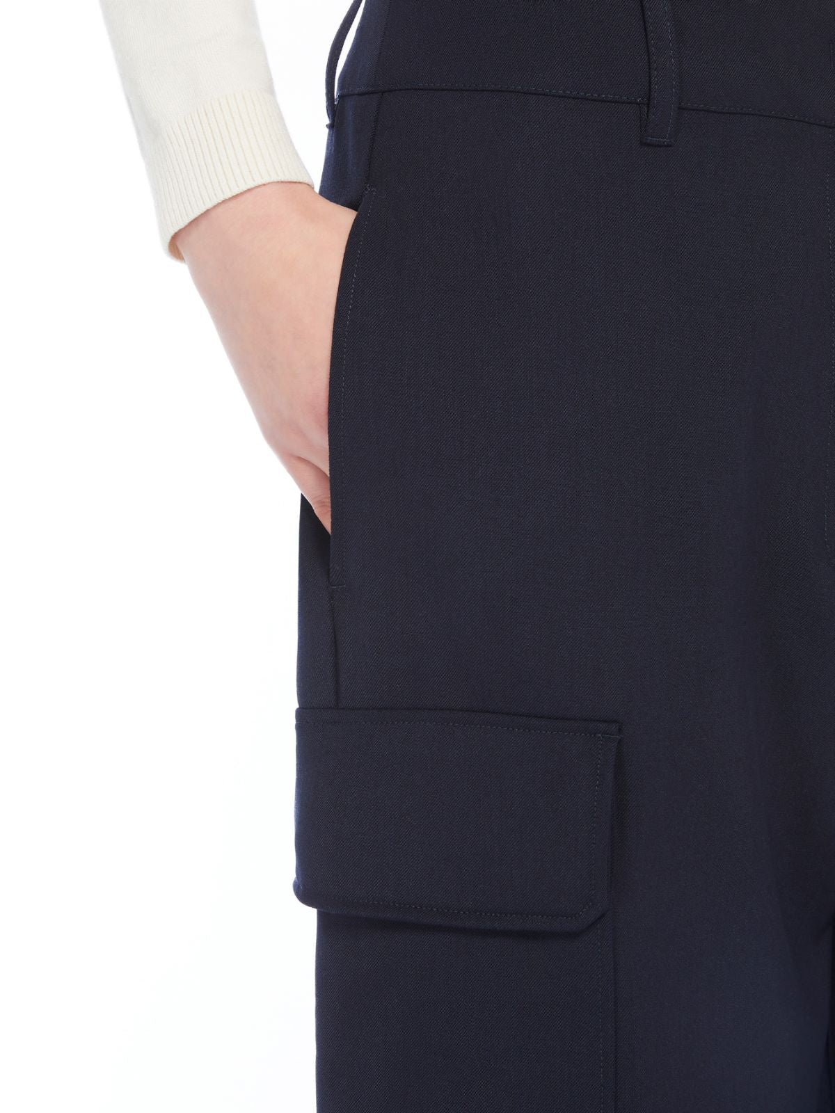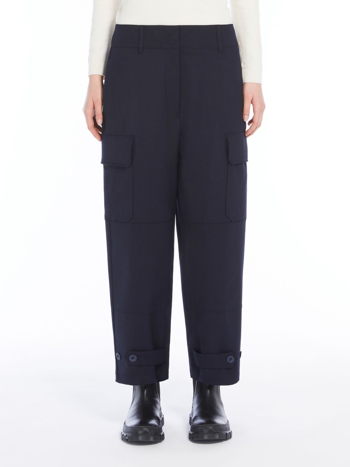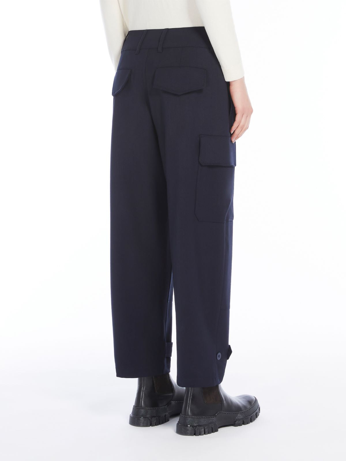 Combat-style trousers in stretch technical wool gabardine fabric featuring maxi flap pockets on the leg and in-seam side pockets. Embellished with belt loops at the waist and press stud-fastening flap rear pockets. The hem tabs can be used to adjust the fit and volume of the trousers. High-cut waistband and a fly-covered zip and hook-and-bar fastening.