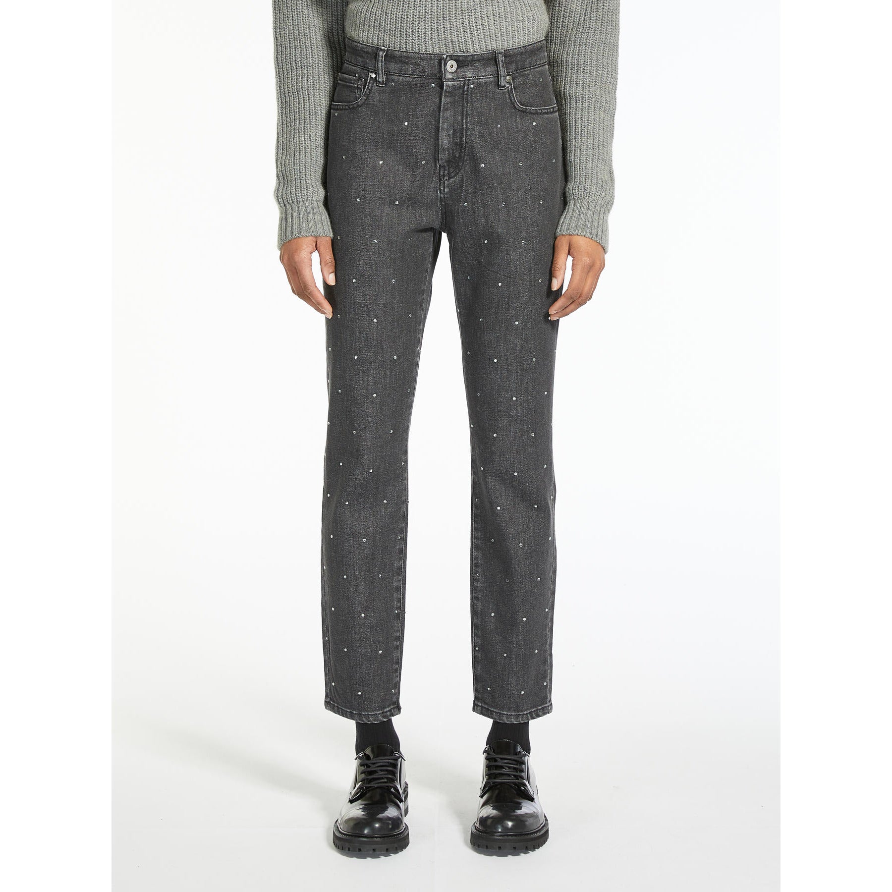 5-pocket-style trousers in stretch cotton denim fabric featuring a yoke and patch rear pockets. The metal rivets, in addition to the rhinestone appliqué details on the front and back, accentuate the garment's texture. Zip and button fastening.