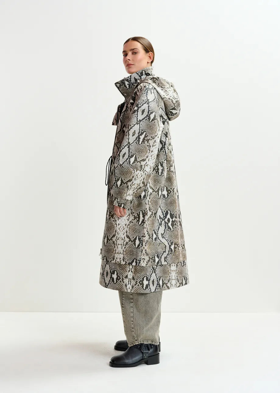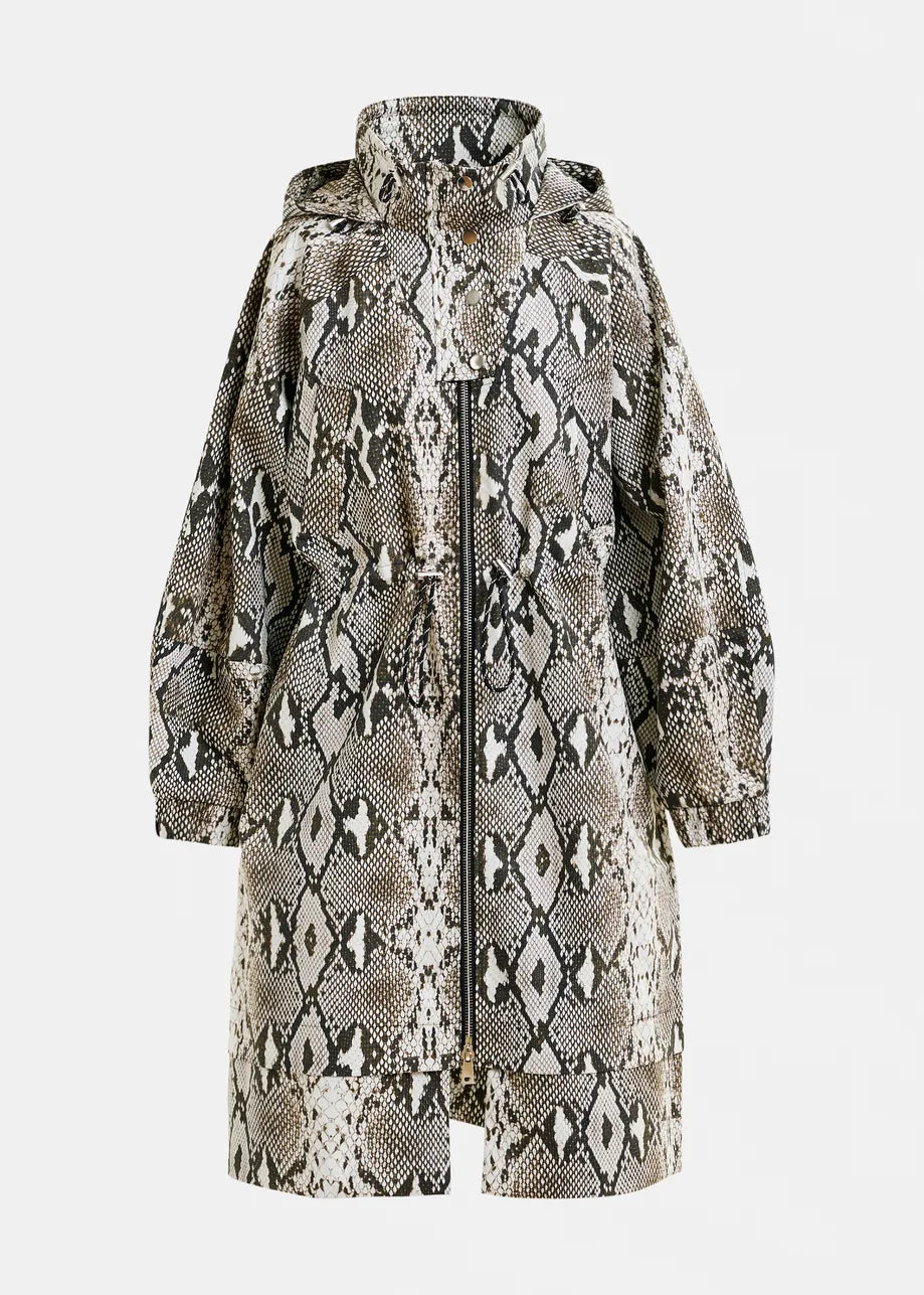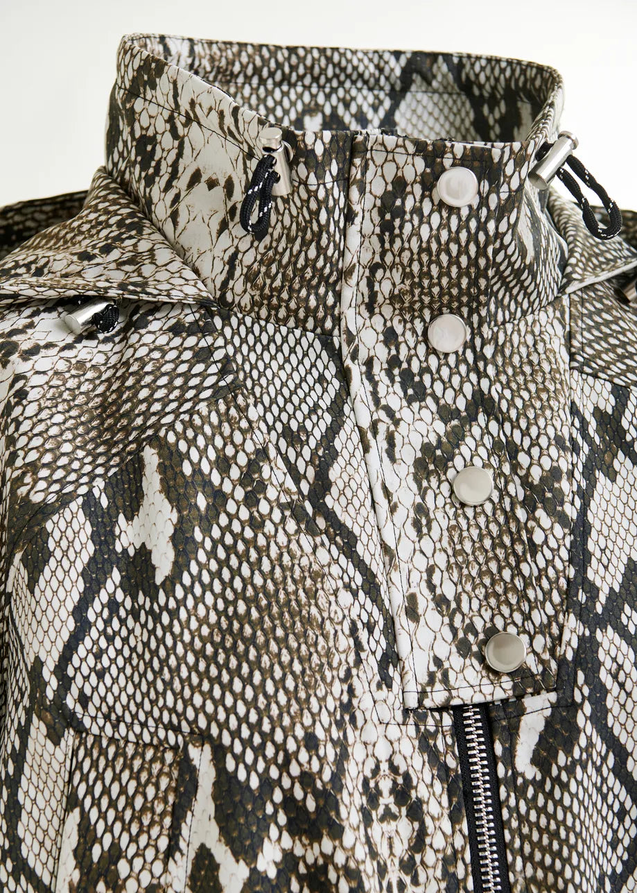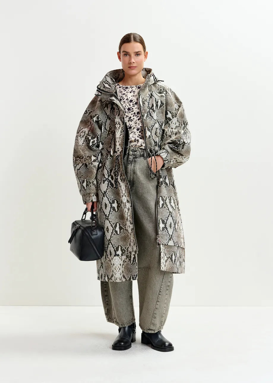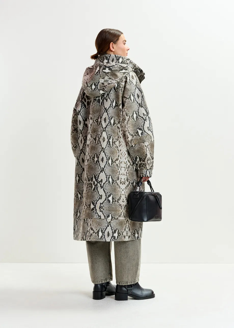 Essentiel Antwerp IDENTIFY Snakeprint Green, beige and black oversized hooded raincoat