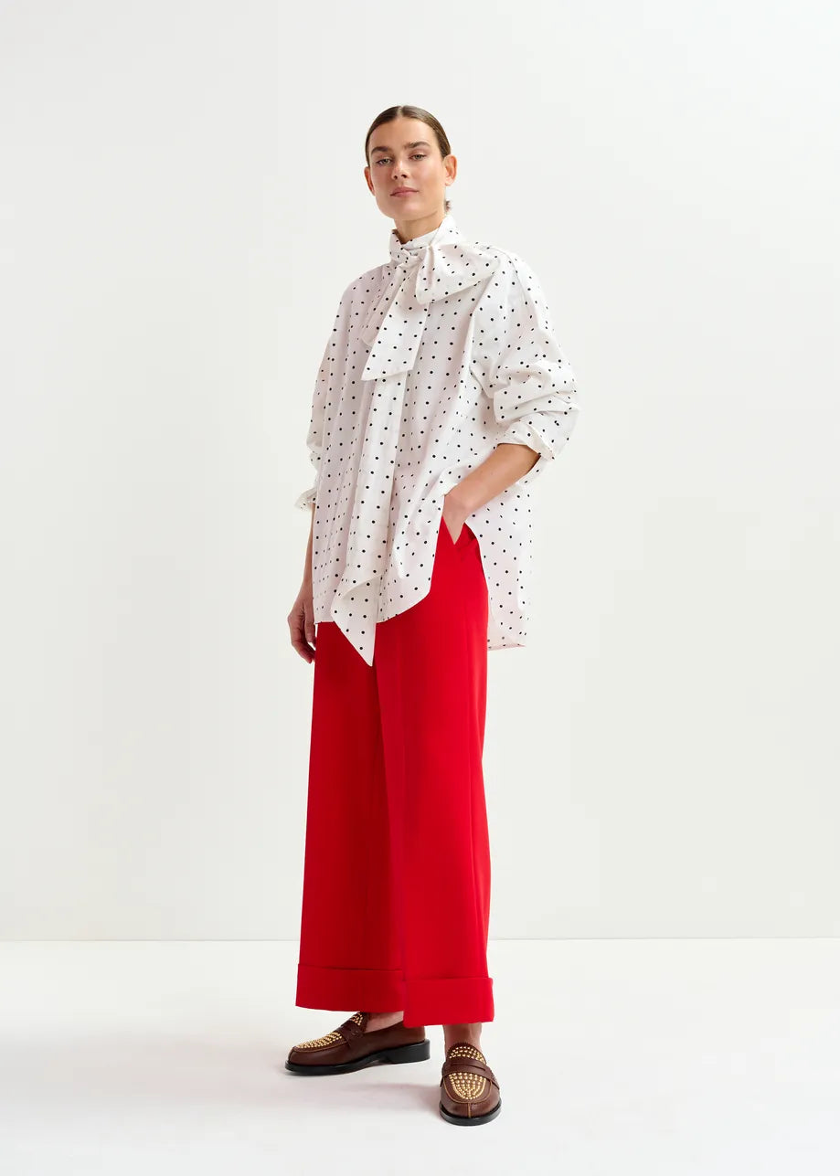 Essentiel Antwerp IMOVERIT White and black polkadot cotton shirt with pussy bow