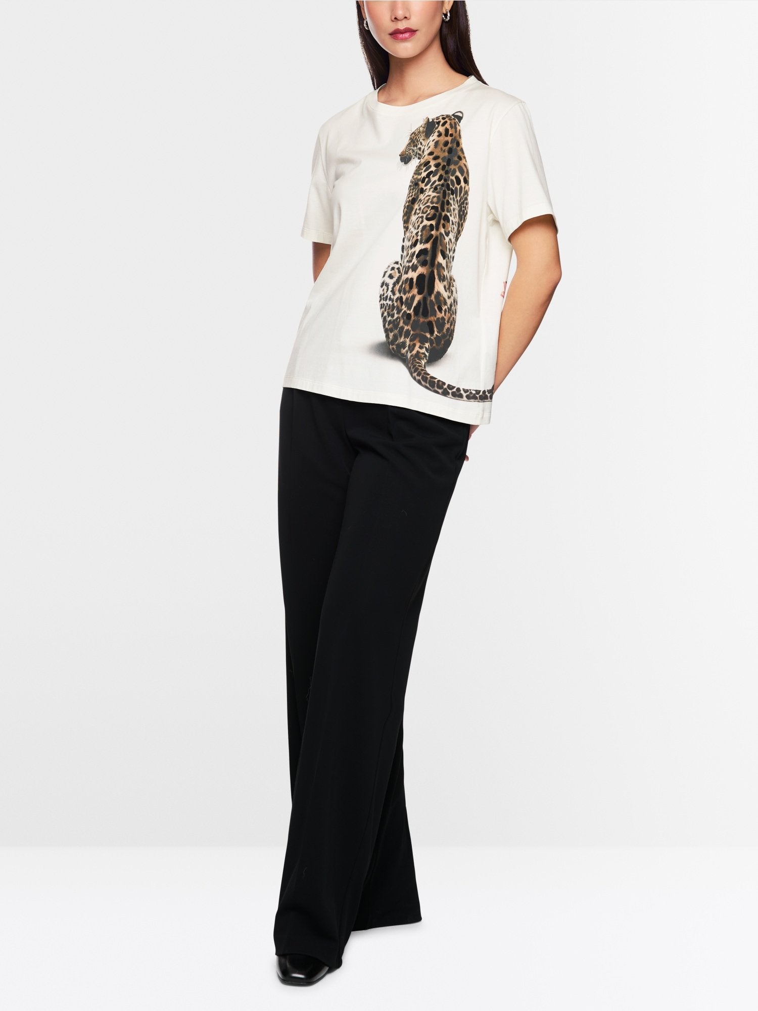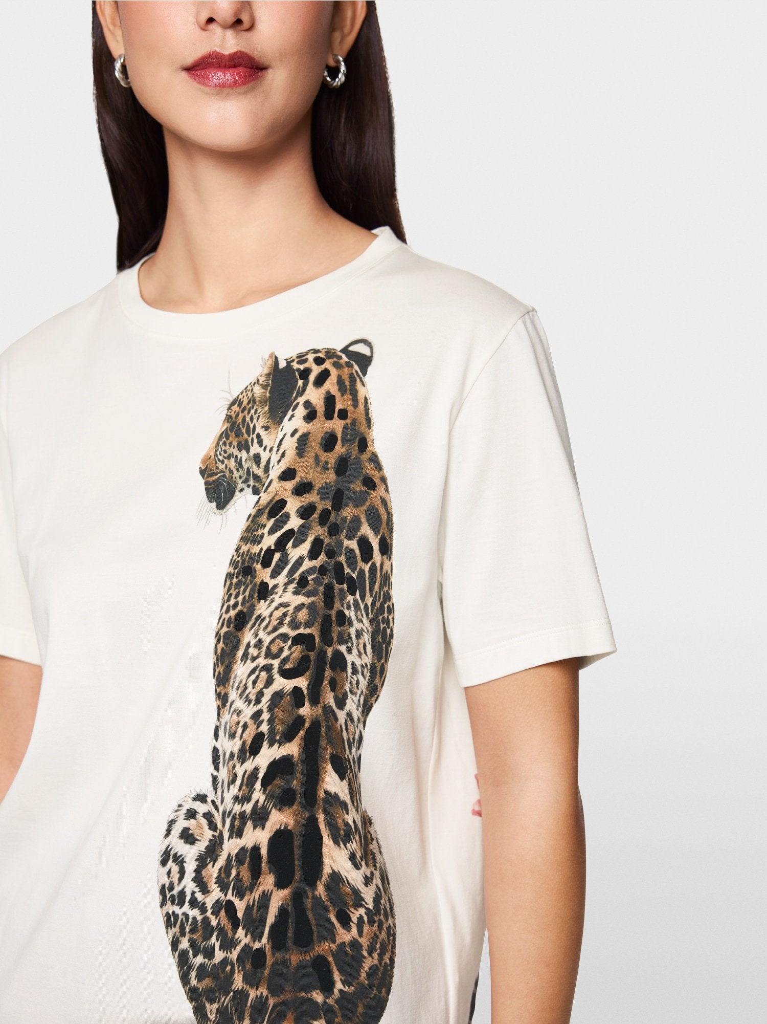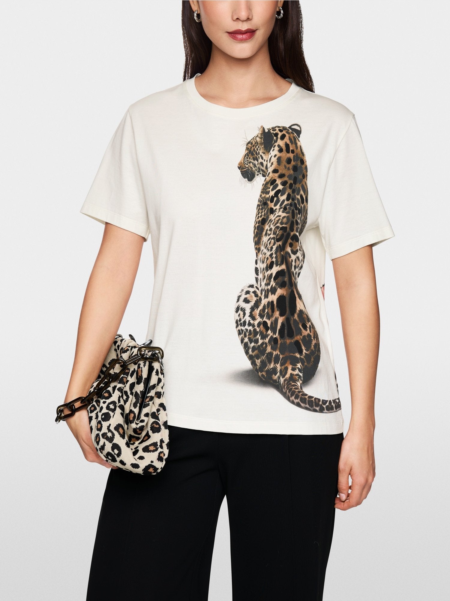 This organic cotton T-shirt combines sustainability and style. With its straight cut and round neckline, it offers a casual fit. Its leopard print with velvet details creates a modern look, while the floral detail on the back adds a unique accent. A versatile shirt that can be combined for both casual and chic looks.