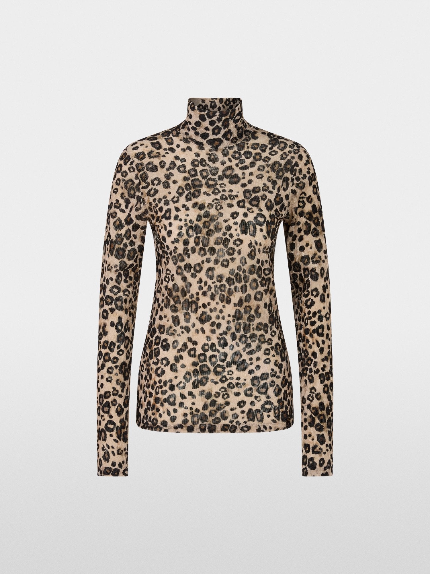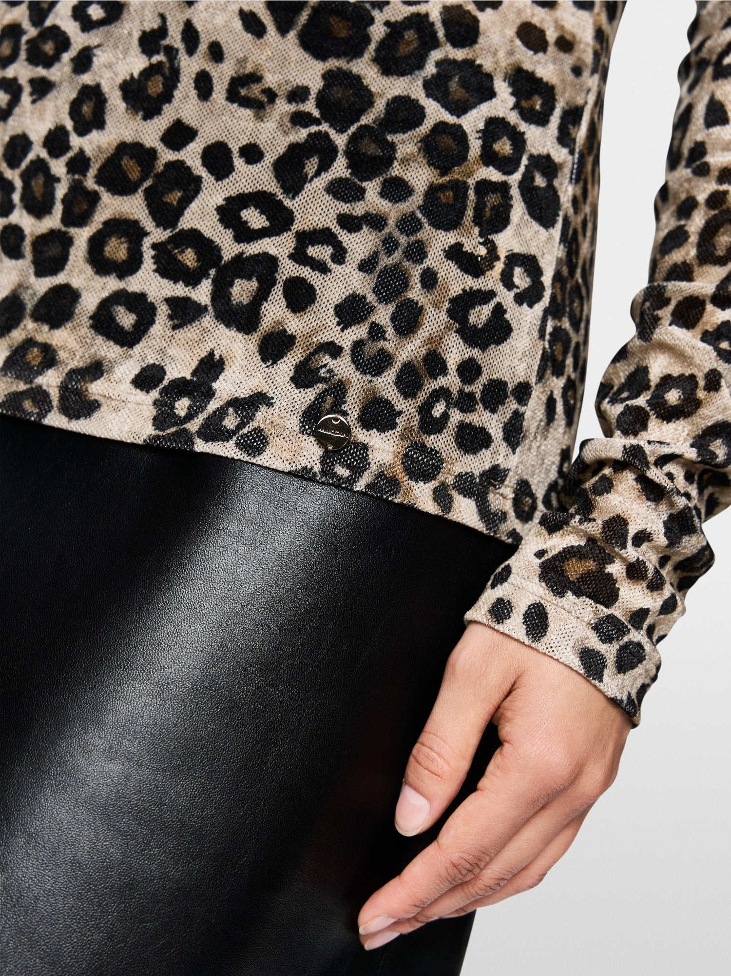 This semi-transparent long-sleeved top impresses with its velour feel and eye-catching leopard print. The figure-hugging cut emphasises the silhouette, while the high turtleneck creates a modern, elegant look. This top is versatile and a real eye-catcher for special occasions or everyday wear.