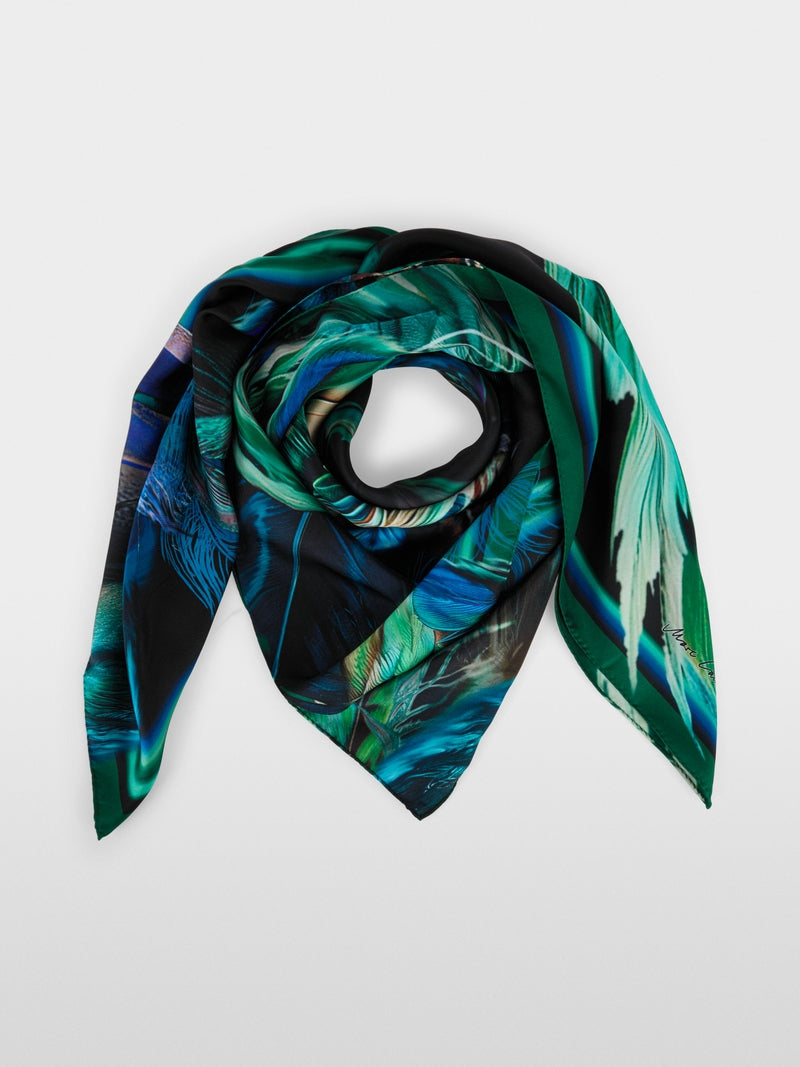 Elegant square silk scarf with a detailed feather print in a mystical look. The luxurious silk gives the scarf a soft sheen and makes it comfortable to wear. Versatile – whether as a neckerchief, hair band or bag accessory – this scarf ensures a stylish, expressive look.