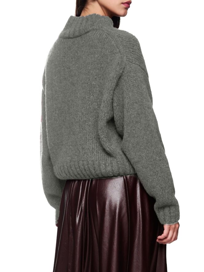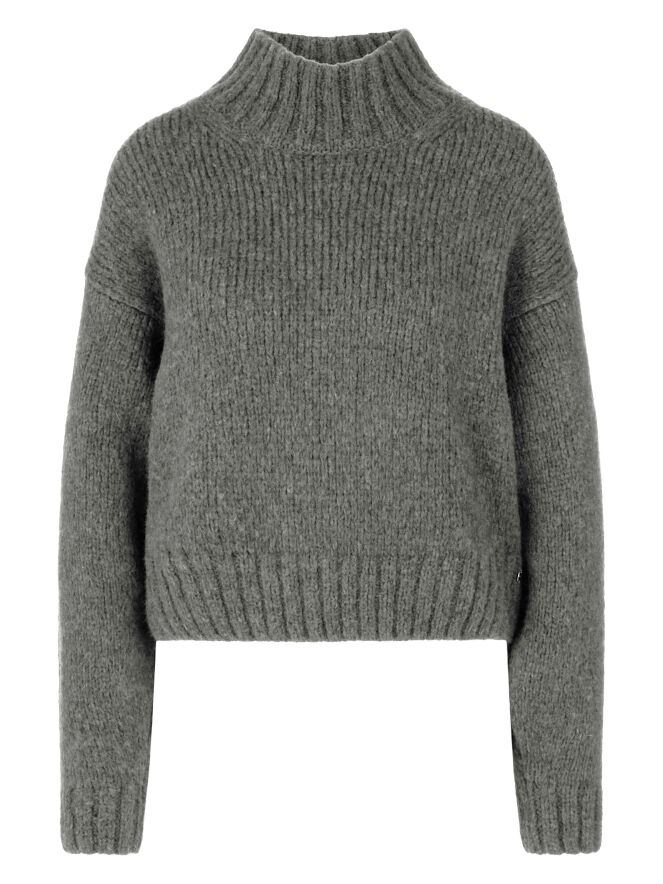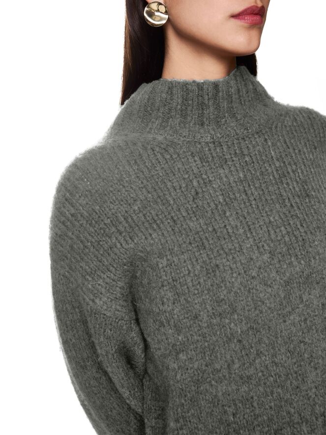 With its wide sleeves and a stand-up collar, this cosy jumper ensures ultimate comfort. Its alpaca content makes it particularly soft, while the raglan sleeves and loose, balloon-like cut ensure a modern fit. Perfect for cosy, stylish looks in the cold season. This jumper is knitted and finished in Germany. The individual parts are further processed at European partner companies. It is therefore Knitted in Germany.