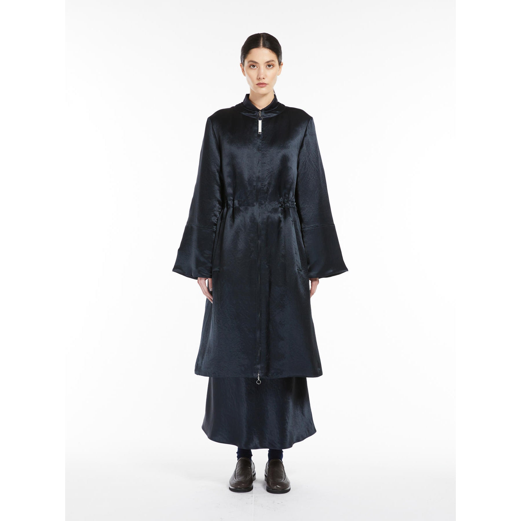 Max Mara MM PIROGA Navy Satin Long Line Bomber Jacket