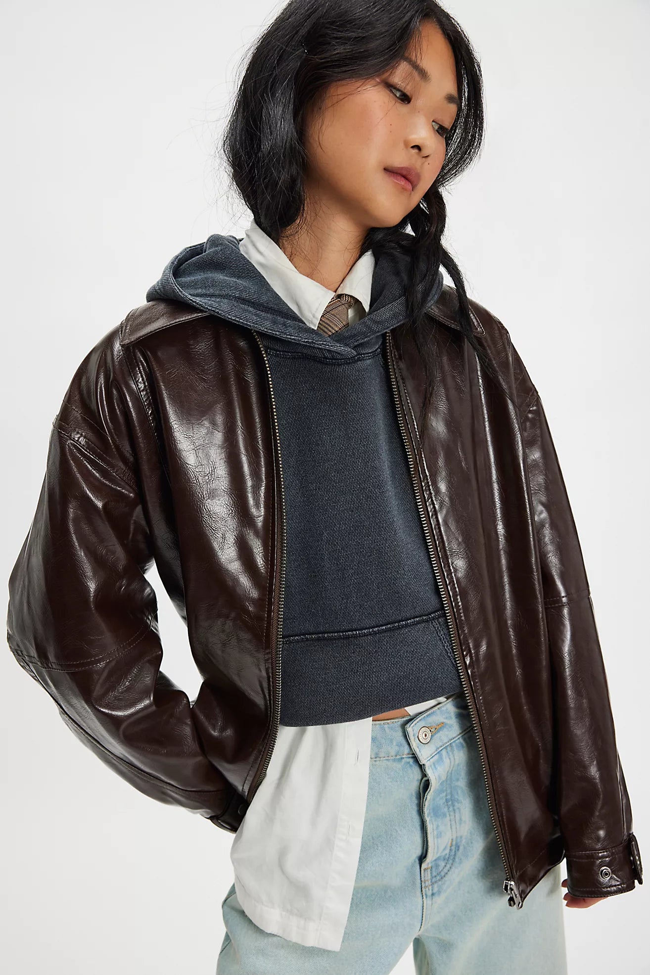 Catch eyes in this vegan leather jacket from We The Free, featured in a classic cut with a high-shine finish for a statement look.