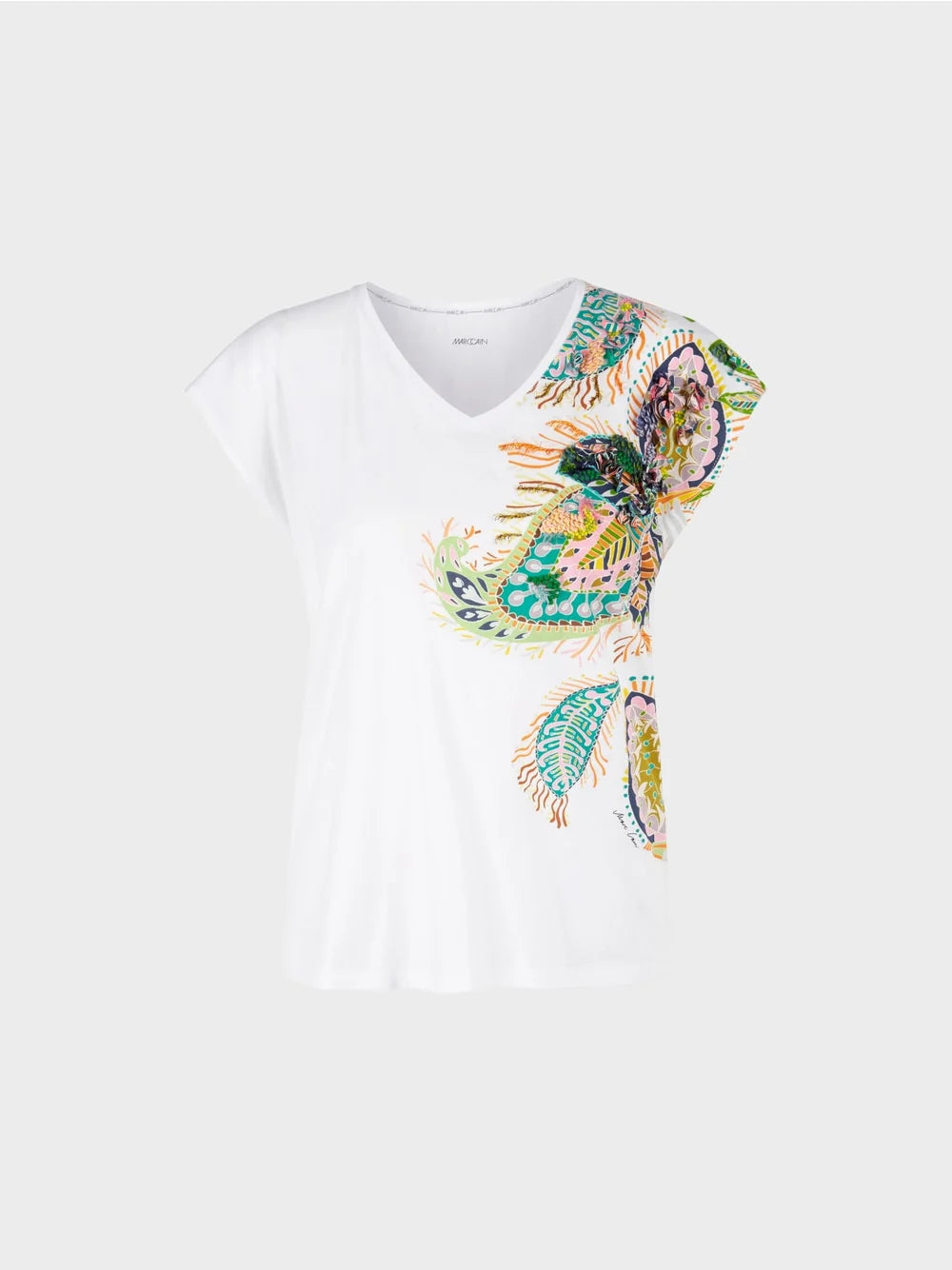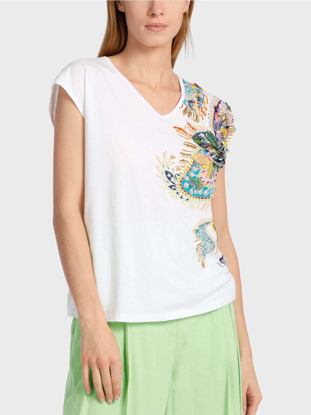Oversized T-shirt made from pure cotton. Cut details include a V-neckline and indicated sleeves. The print - a fancy leaf motif - is placed asymmetrically. Individual parts of the print are embroidered with beads, sequins and yarns.