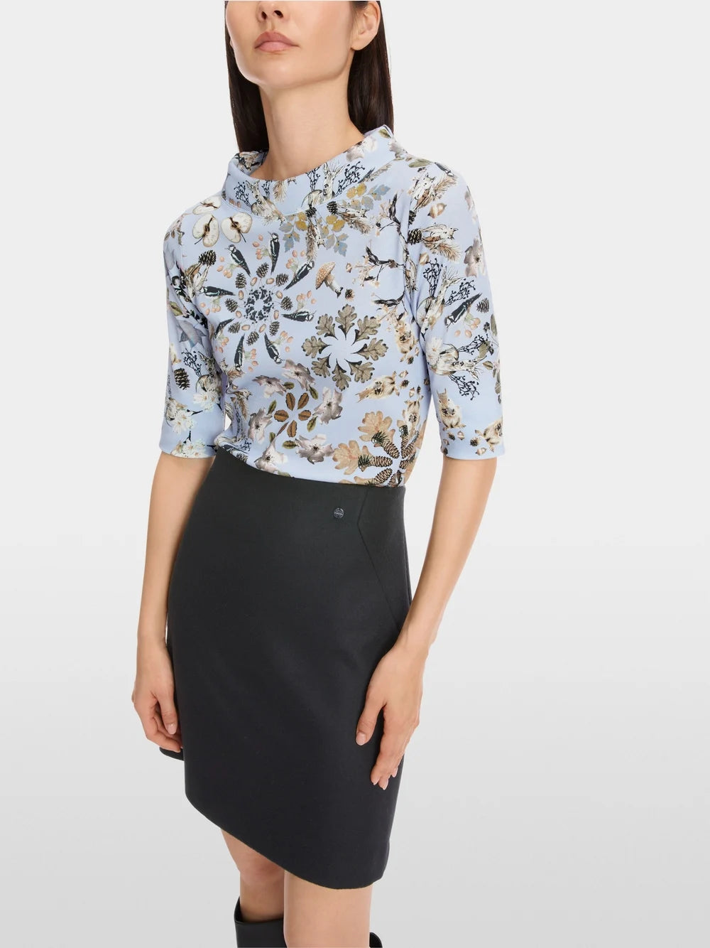 T-shirt made of soft cotton rib with elastane. This garment has a close-fitting shape, a wide round neck and 3/4-length sleeves. The all-over print is a collage of autumnal forest motifs in a photo and hand-drawn design.