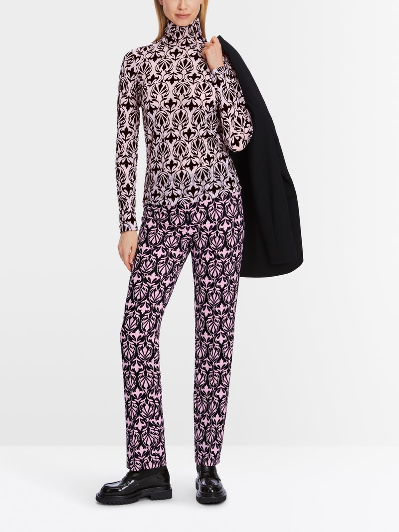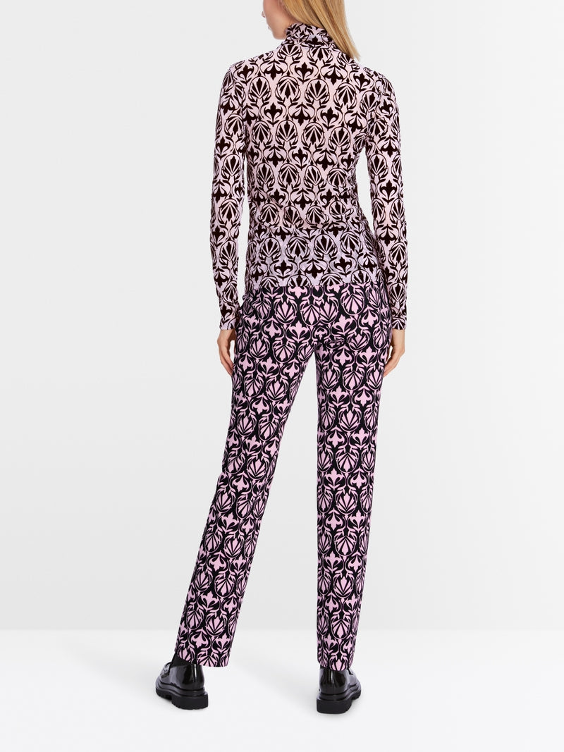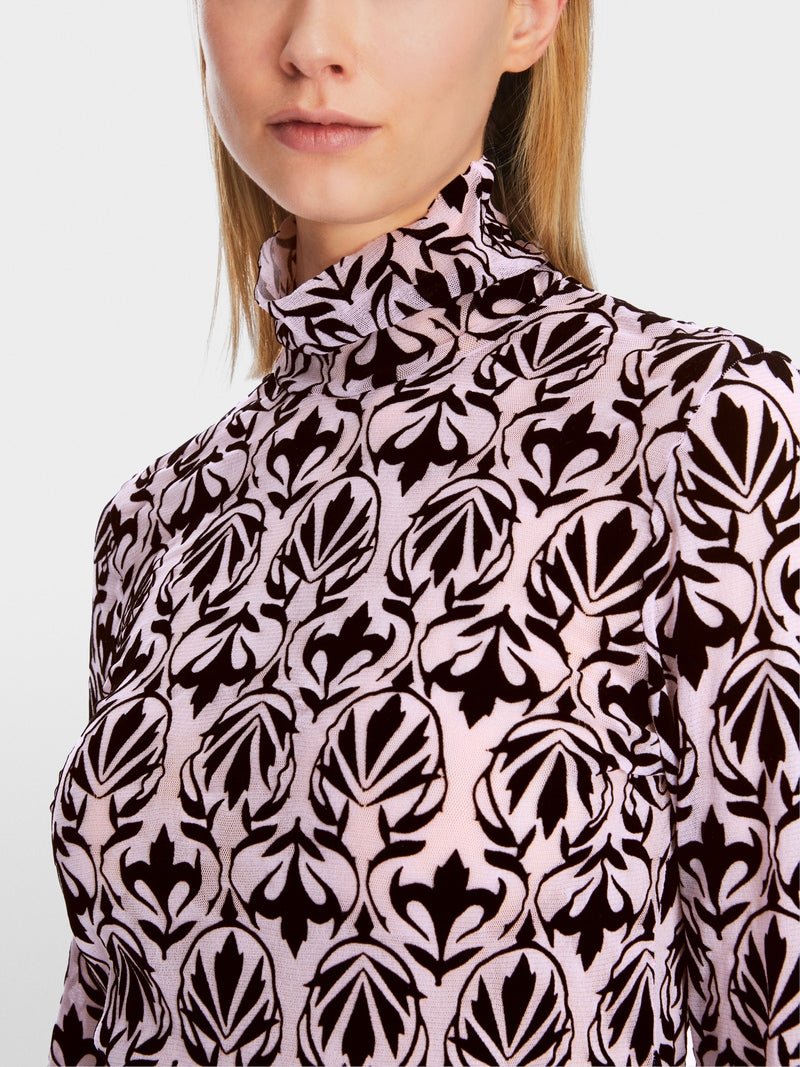 Designed with a figure-hugging cut, this T-shirt stands out with its ornamental print. The top comes as a long sleeve with a high collar. It also stands out with its semi-transparent, very soft material.