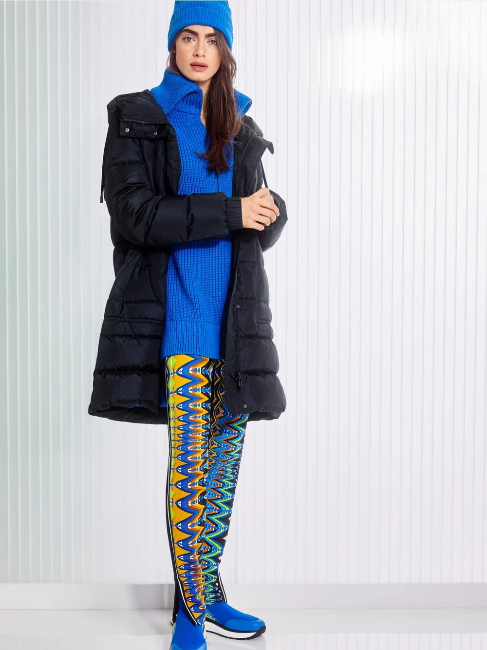 The SOFIA model is a slip-on pant made of soft and elastic scuba jersey. The pant is characterized by a slim fit, elastic waistband and tapered legs. The hem is finished with a side slit. The pant has two different views: the front features an ethnic-inspired print design, while the back is plain.