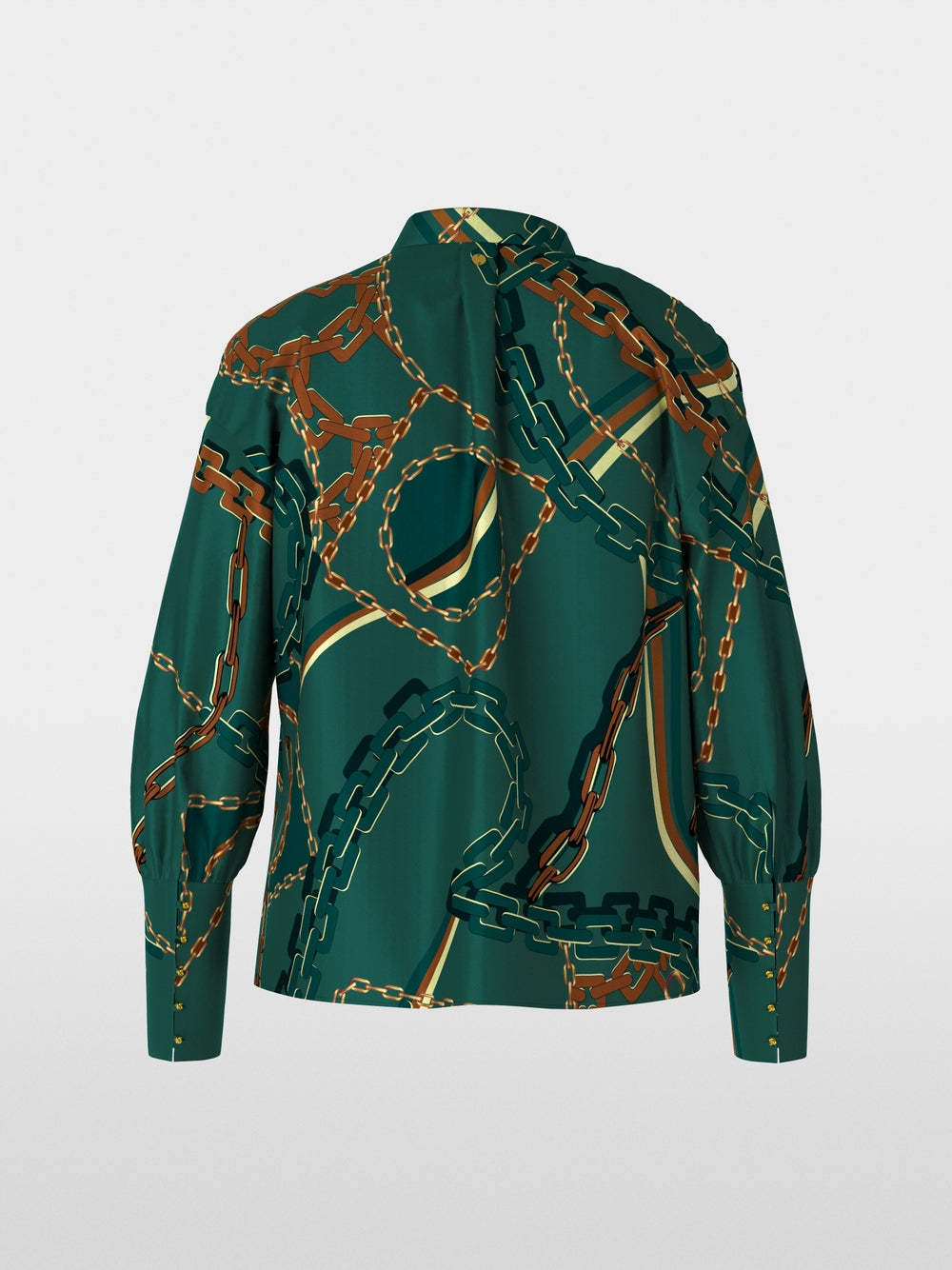Soft, flowing material and a chic chain print characterize the look of this blouse. It has a wide silhouette with a stand-up collar and extra-wide cuffs with lots of small buttons. The button placket at the front is discreetly concealed.