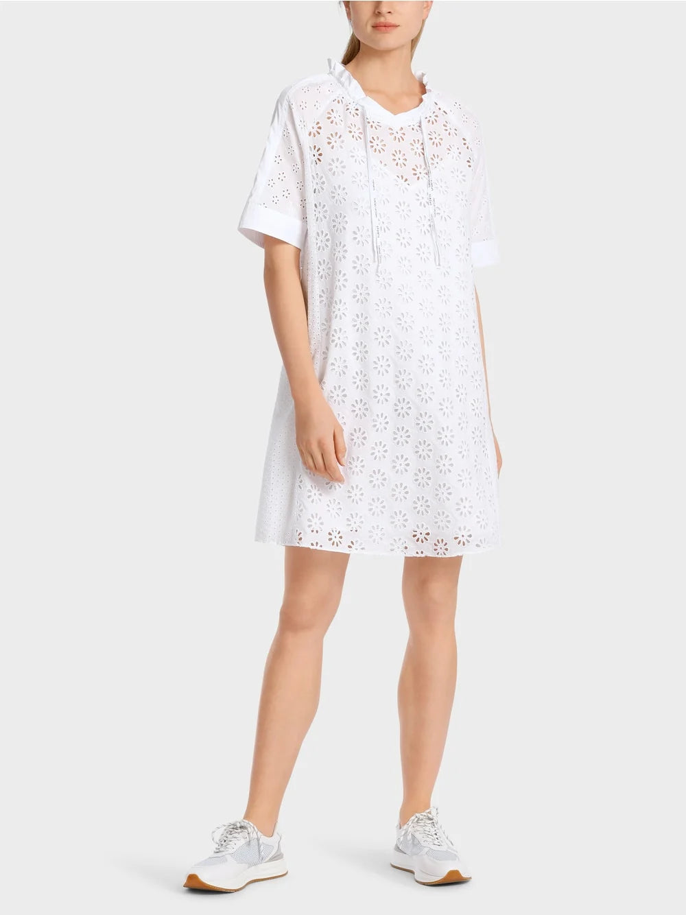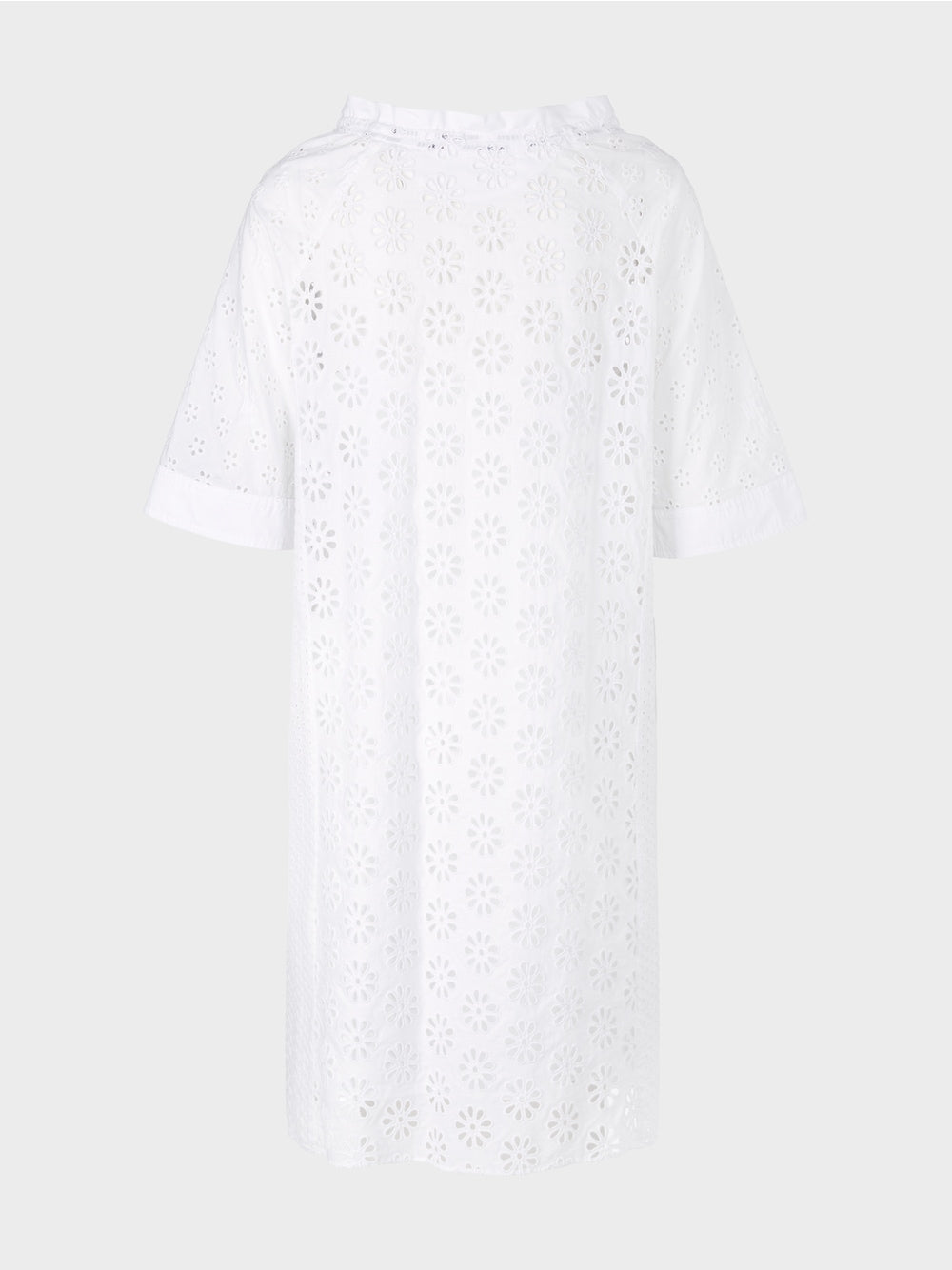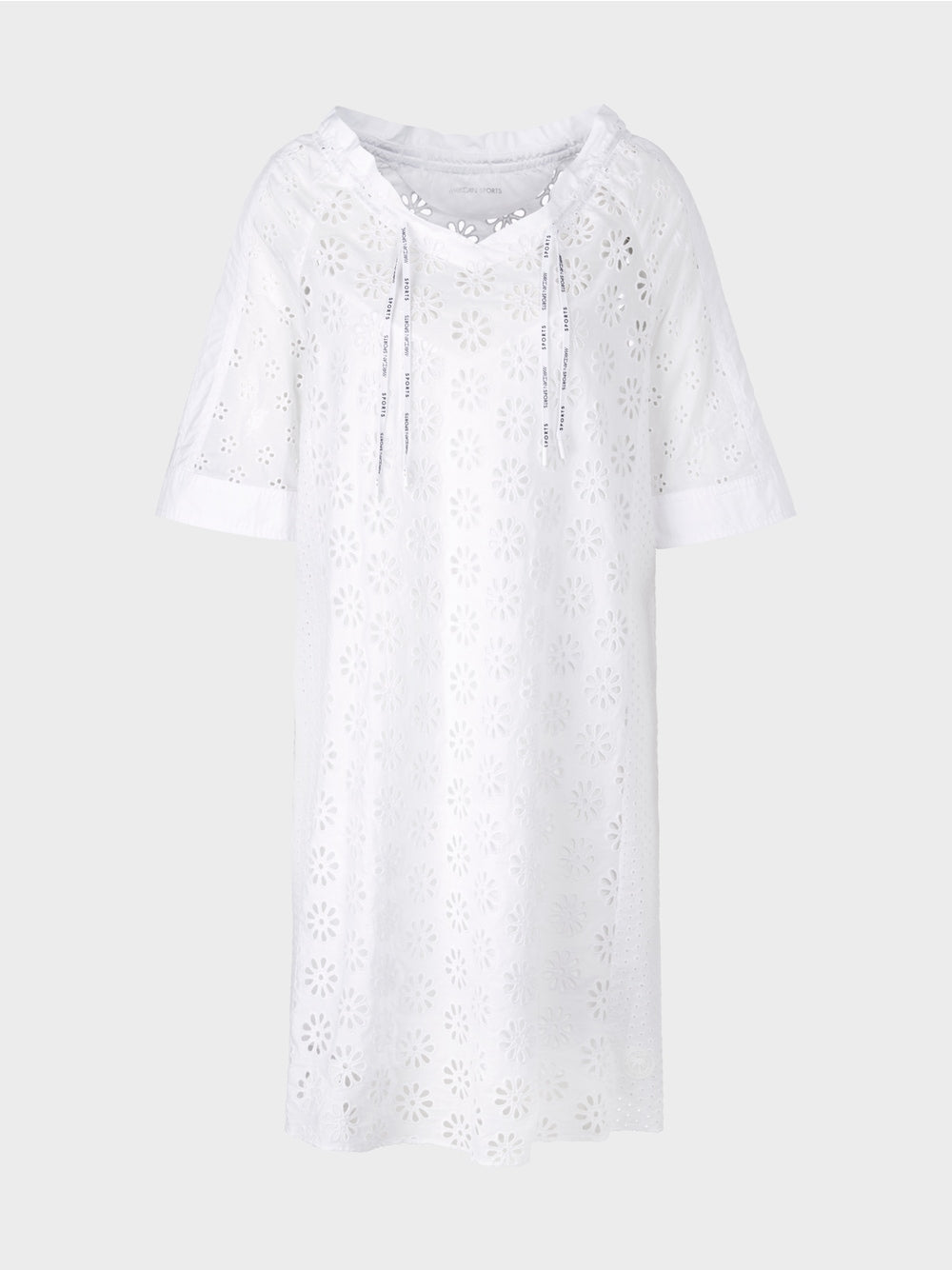 Loose-fitting dress made from pure cotton. This dress features a playful mix of fabrics with eyelet embroidery. It comes with half-length raglan sleeves to match. The wide round neck can be adjusted as desired with a ribbon. The cooling inner lining is also made from pure cotton.