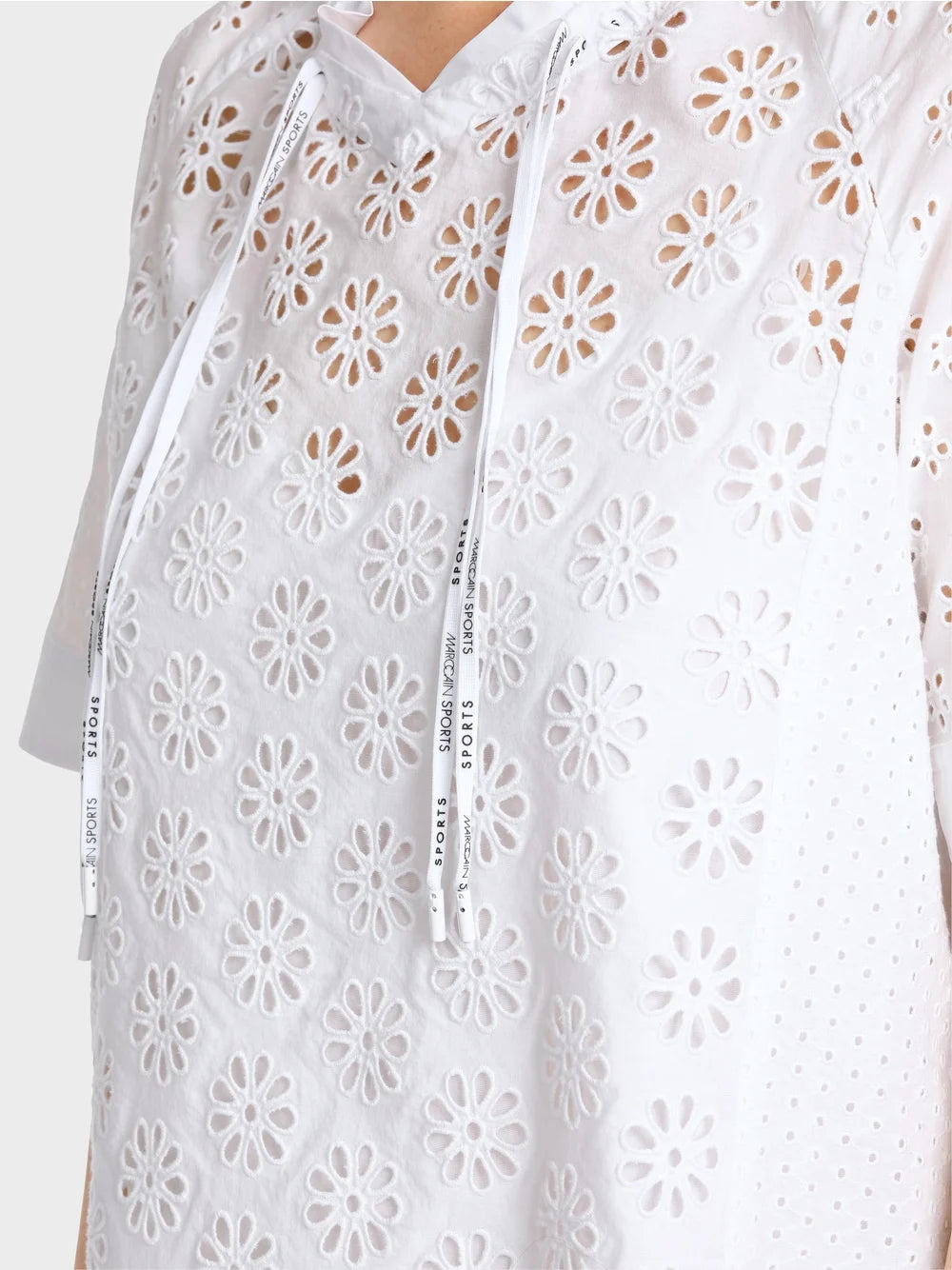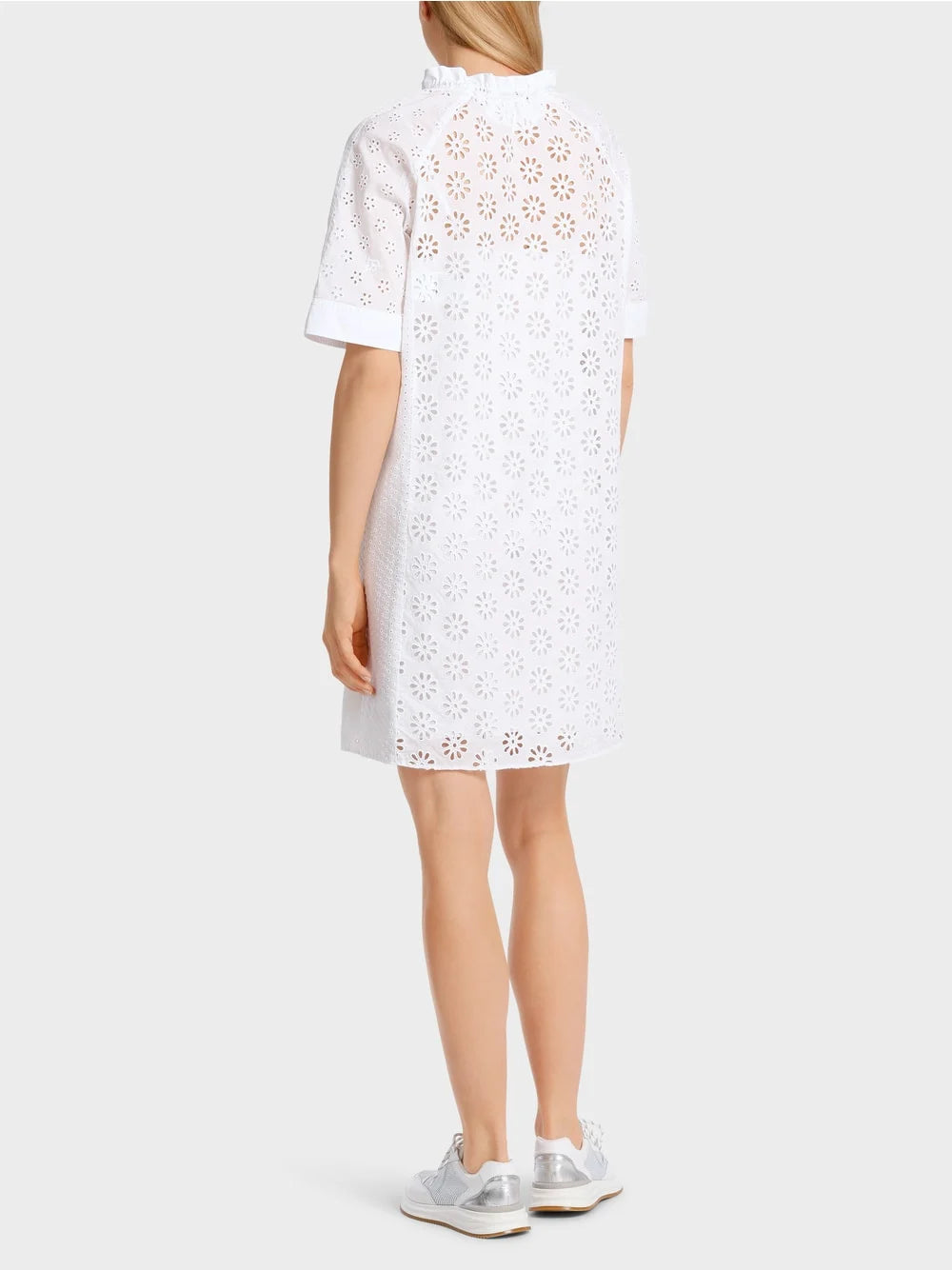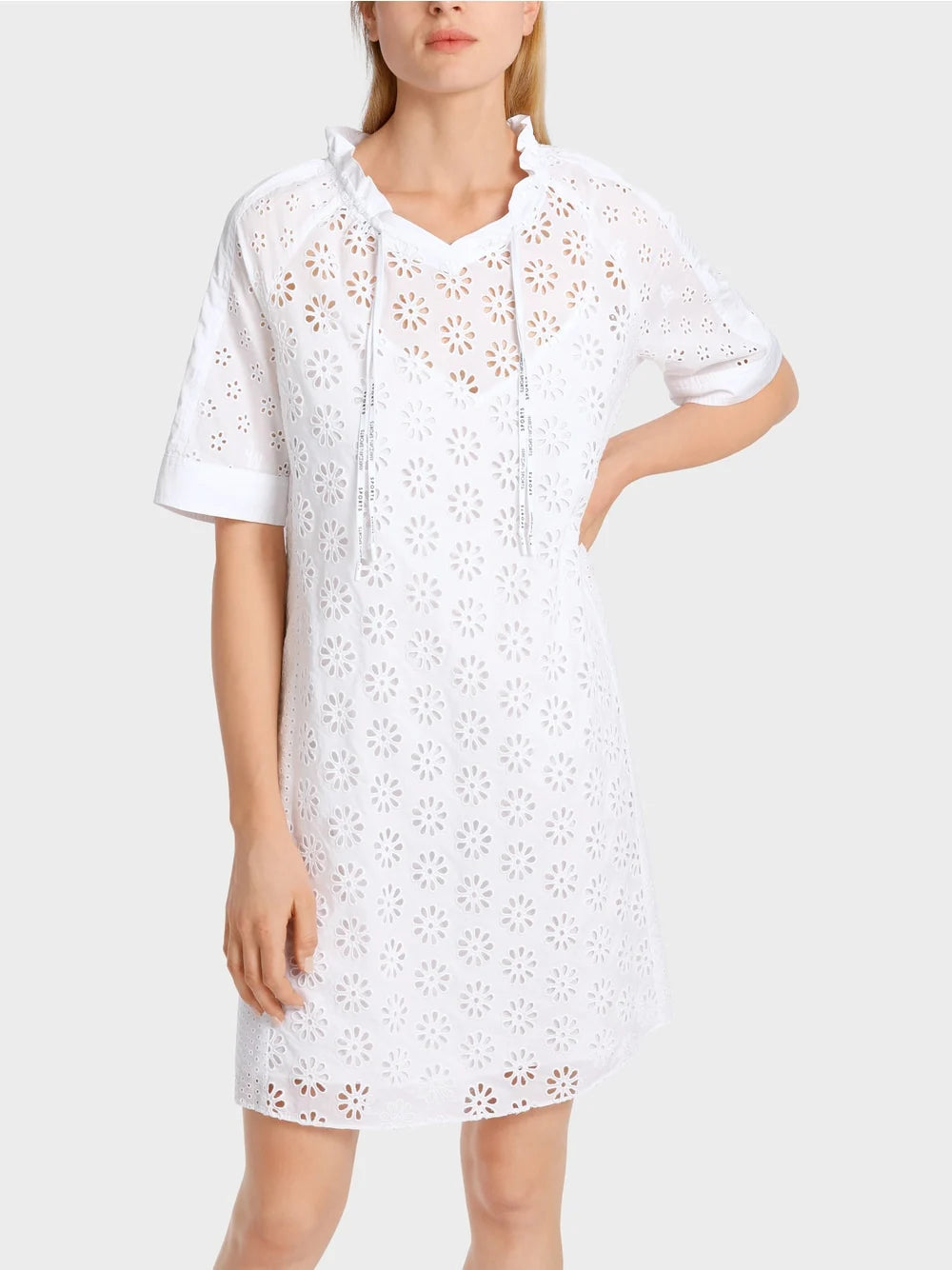 Loose-fitting dress made from pure cotton. This dress features a playful mix of fabrics with eyelet embroidery. It comes with half-length raglan sleeves to match. The wide round neck can be adjusted as desired with a ribbon. The cooling inner lining is also made from pure cotton.