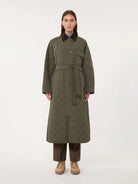 Long padded coat in Luxepad ultra-fine insulating technology camel-silk blend edition, and matching belt at the waist.