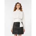 Feminine silhouette shirt with draped motif on the front and high sash to tie at the waist.
