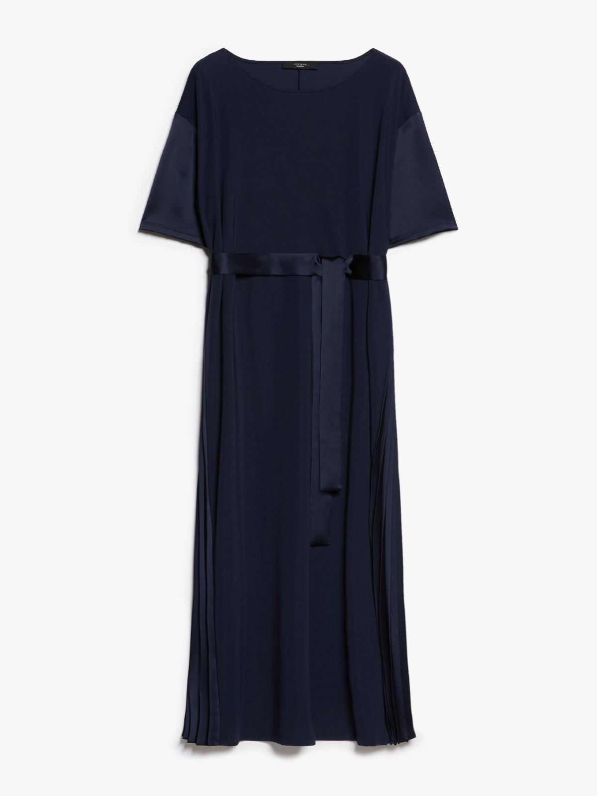 Flared, relaxed-fit long dress in fluid viscose and lyocell jersey fabric featuring elegant pleated satin inserts at the sides and smooth satin sleeves. The boat-neck model boasts drop-shoulder loose-fitting short sleeves and a matching satin belt.