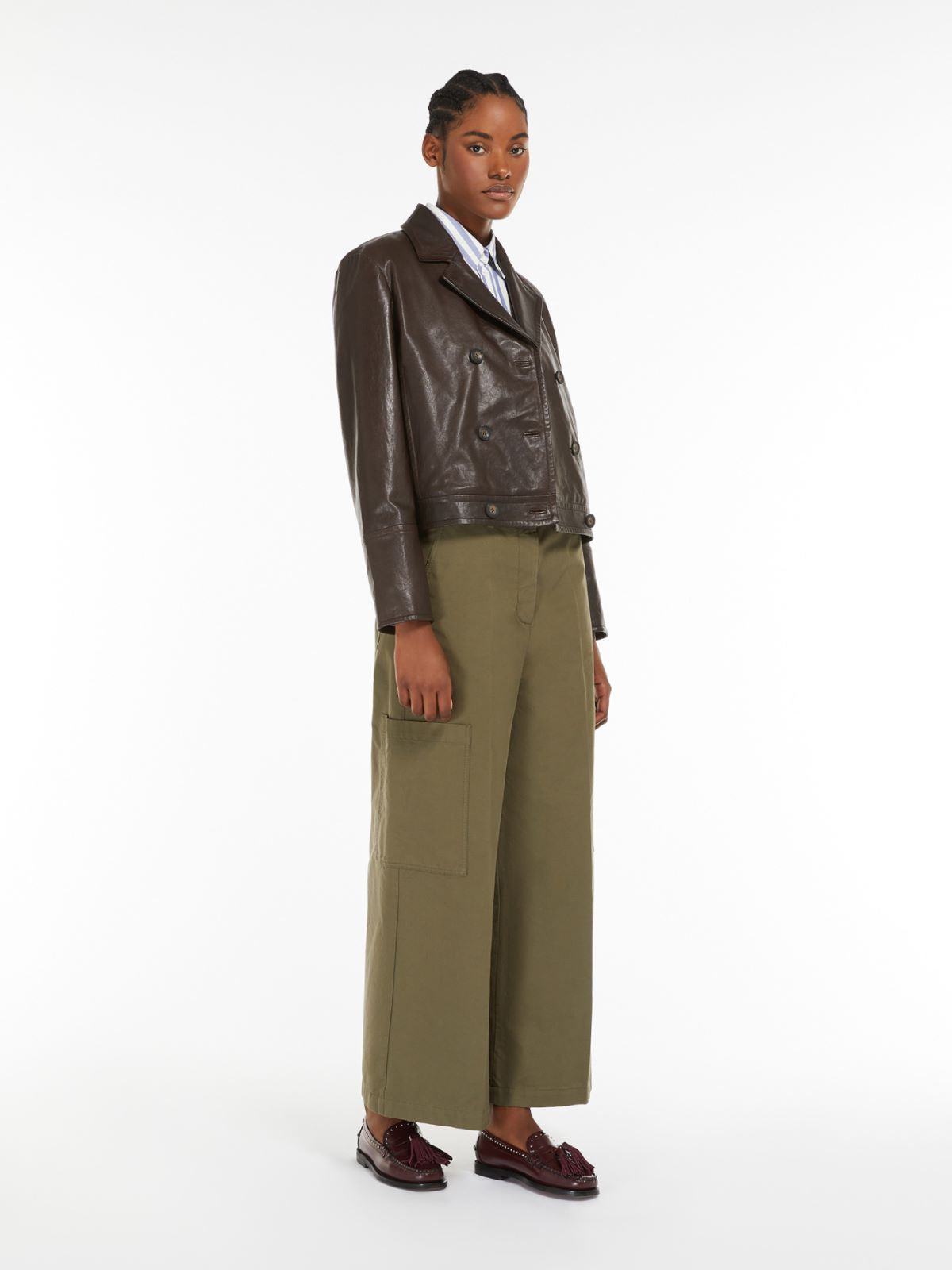 Workwear-inspired trousers in pure cotton canvas. The wide-fit model boasts a cropped ankle cut, maxi patch pockets on the leg and pressed pleat detail. Slant side pockets and buttoned flap-adorned rear pockets. High-cut waistband, complete with a fly-covered zip and button fastening.
