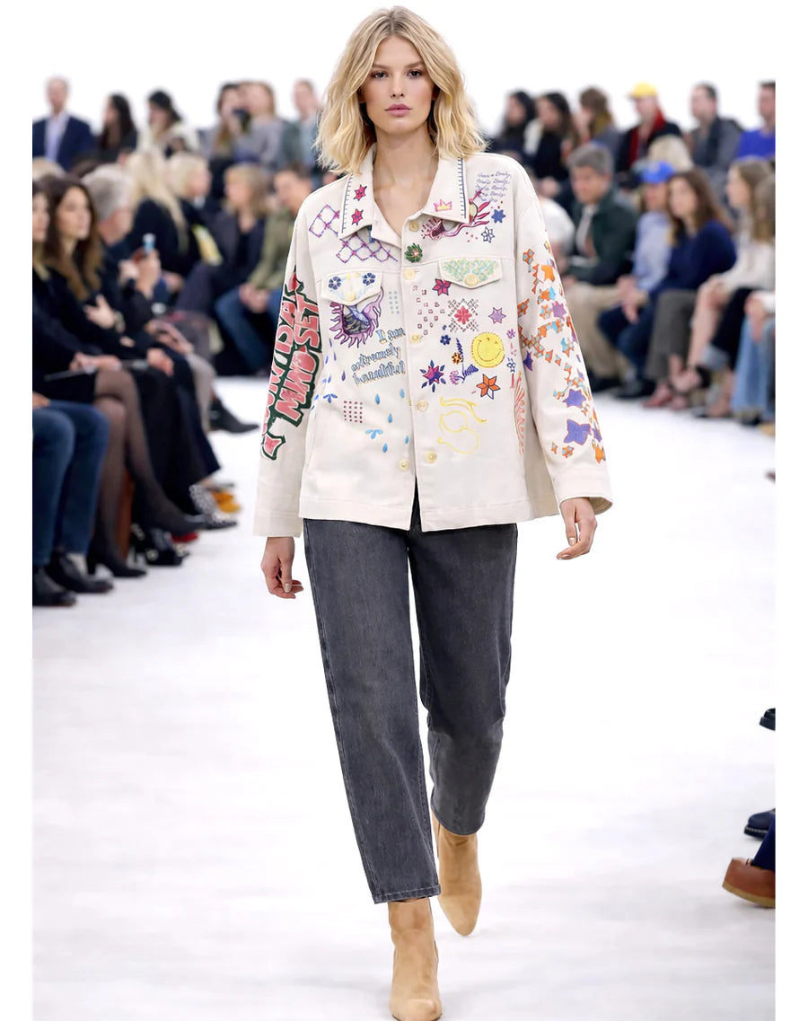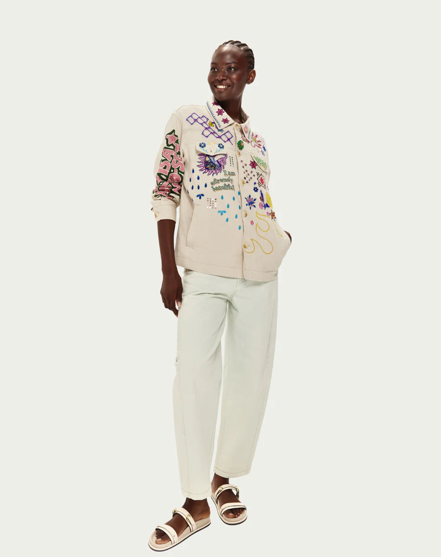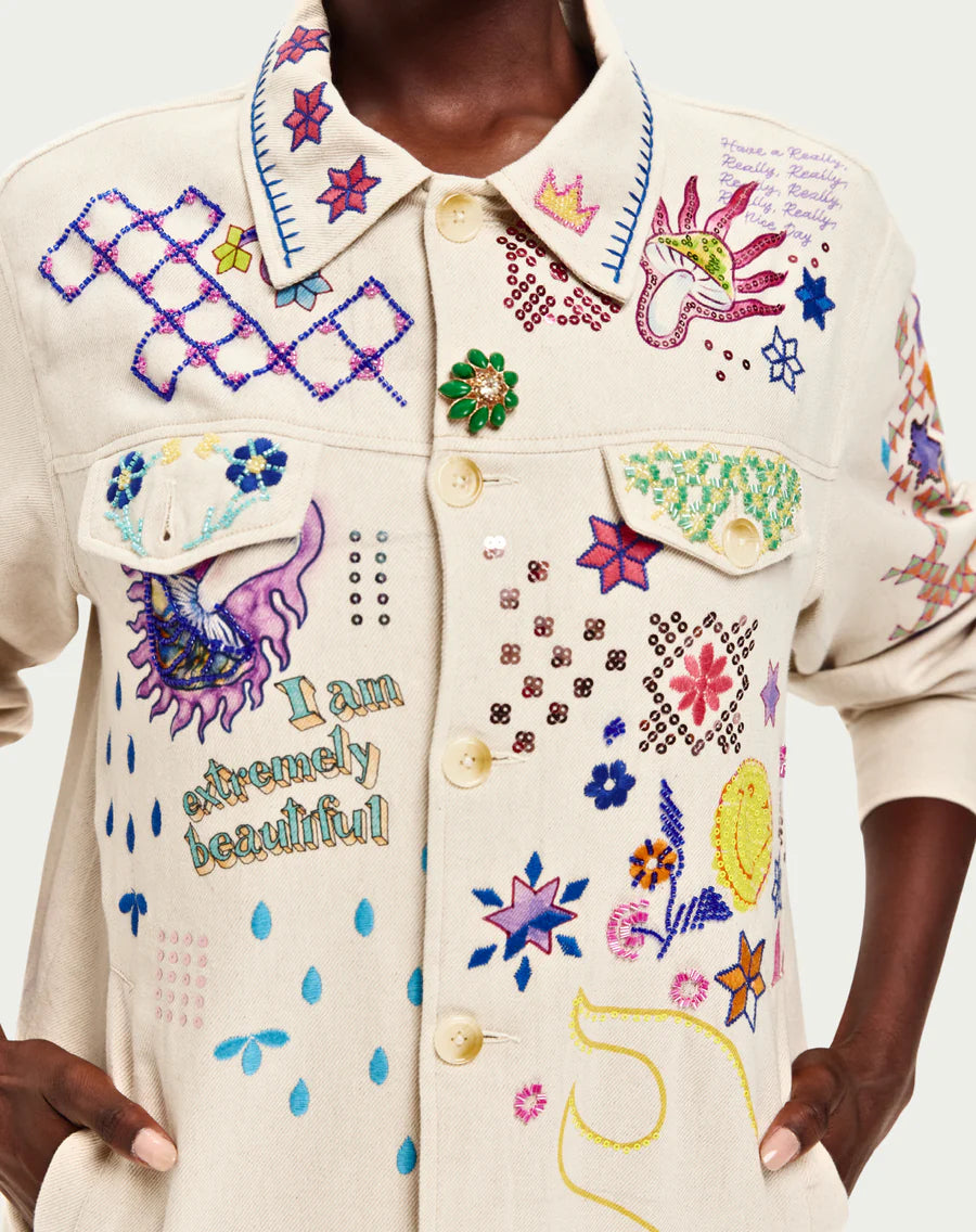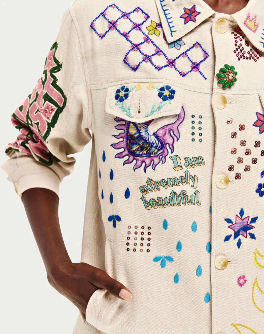 Between worlds, between shapes. This hand-painted denim jacket deconstructs the ordinarybold geometric patterns collide with hand-drawn florals, crying eyes, and empowering statements like "I am extremely beautiful."