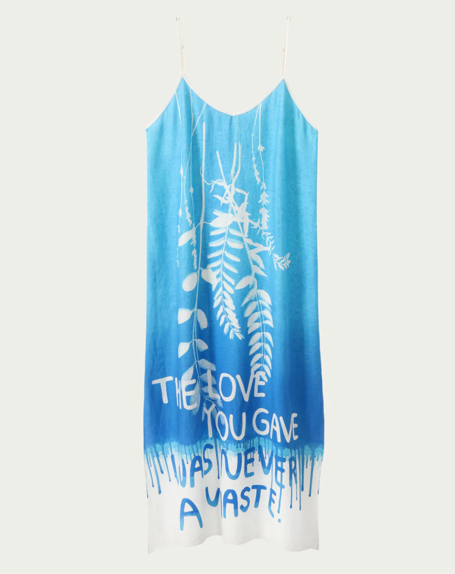 Effortless comfort meets feminine elegance. This relaxed T-dress features a flattering rounded V-neck and long sleeves in deep indigo washes. Side slits add movement and ease to the flowing silhouette.