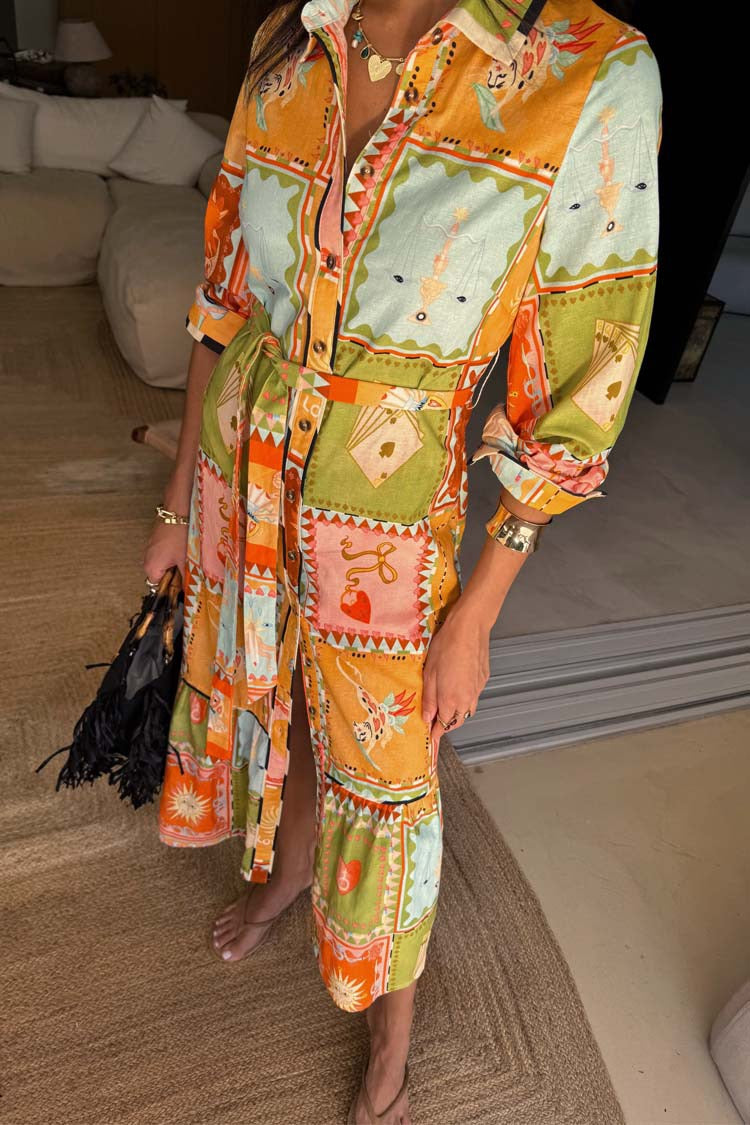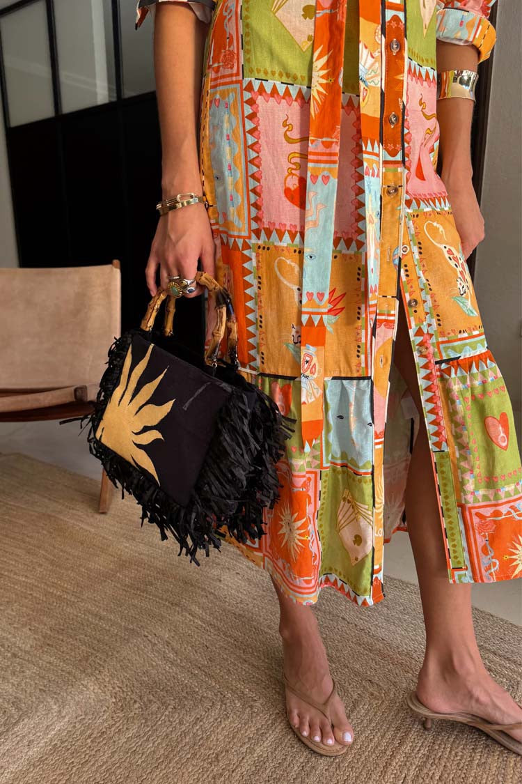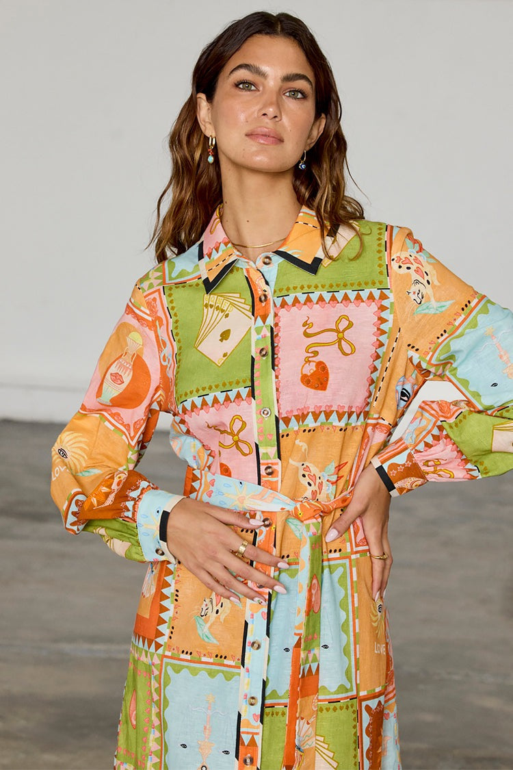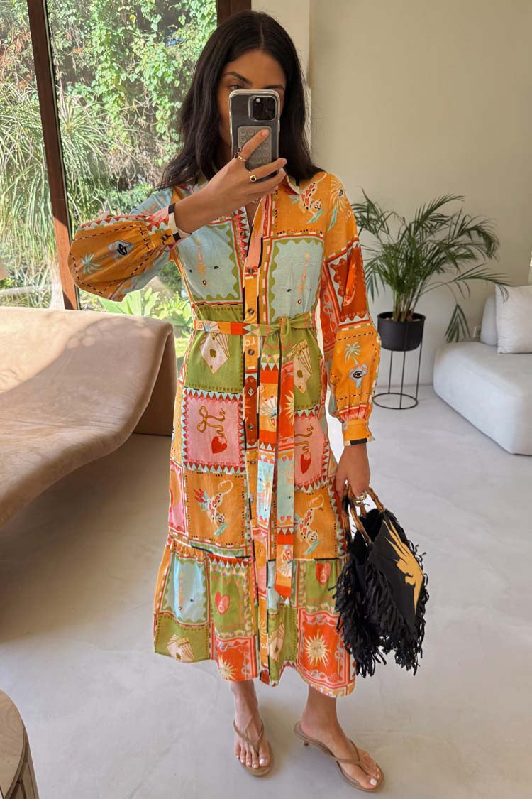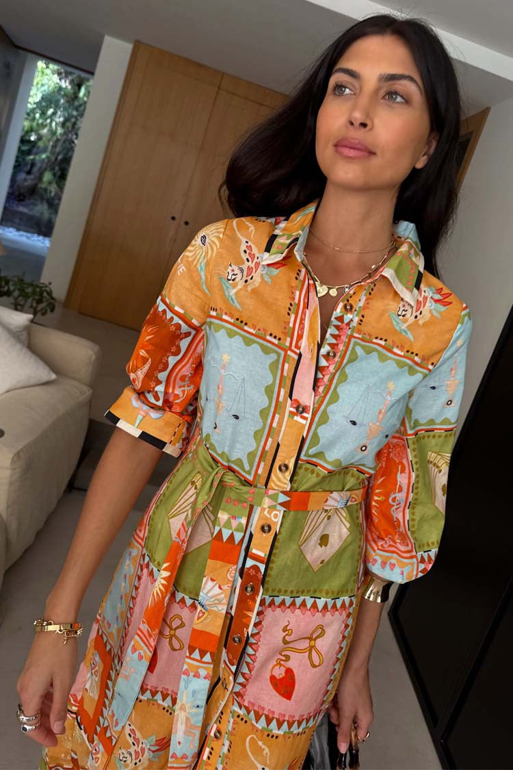 The dress is the perfect winter to spring outfit! In a new Soller print, a lovely multicoloured pattern that ties our trip to the balearic islands with the inspiration found at Colombia Road market all together in a composition of beautiful cameos, with central images of vases, tigers, suns and scales in varying arrangements. The gorgeous print adds a pop of colour to the otherwise simple silhouette, making it a definite a wardrobe staple!