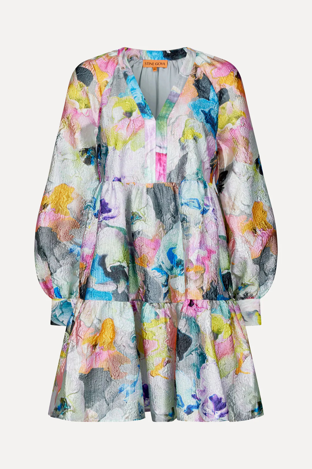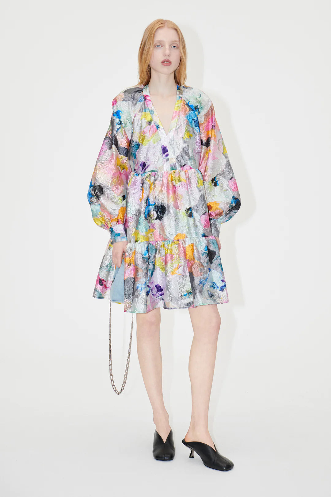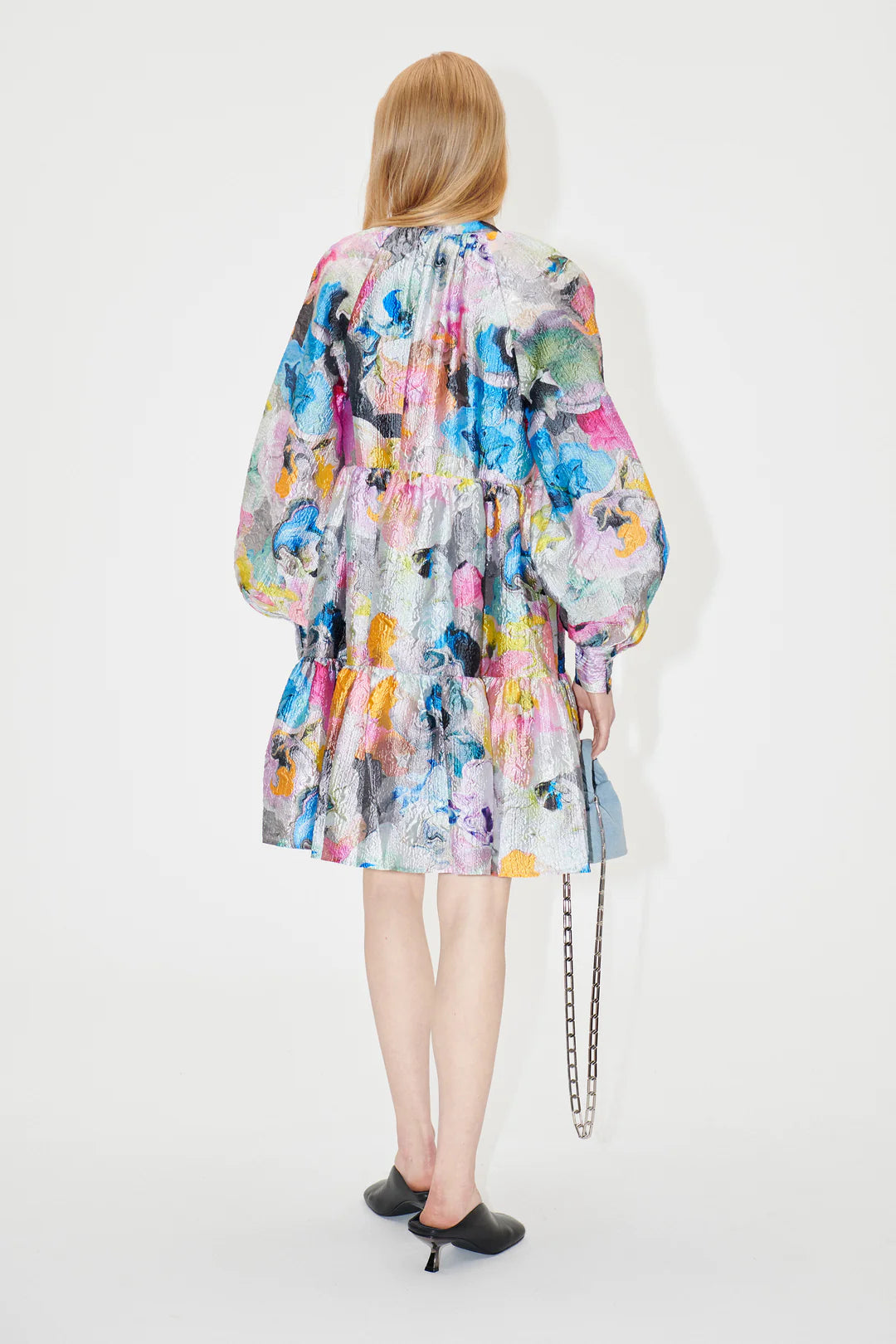 TIERED MINI DRESS WITH PUFFED LONG SLEEVES, SIDE POCKETS AND SHEENED PATTERN. RECYCLED POLYESTER BLEND. FULLY LINED. PAIR WITH THE SGSTEELO HEELS IN JET BLACK.