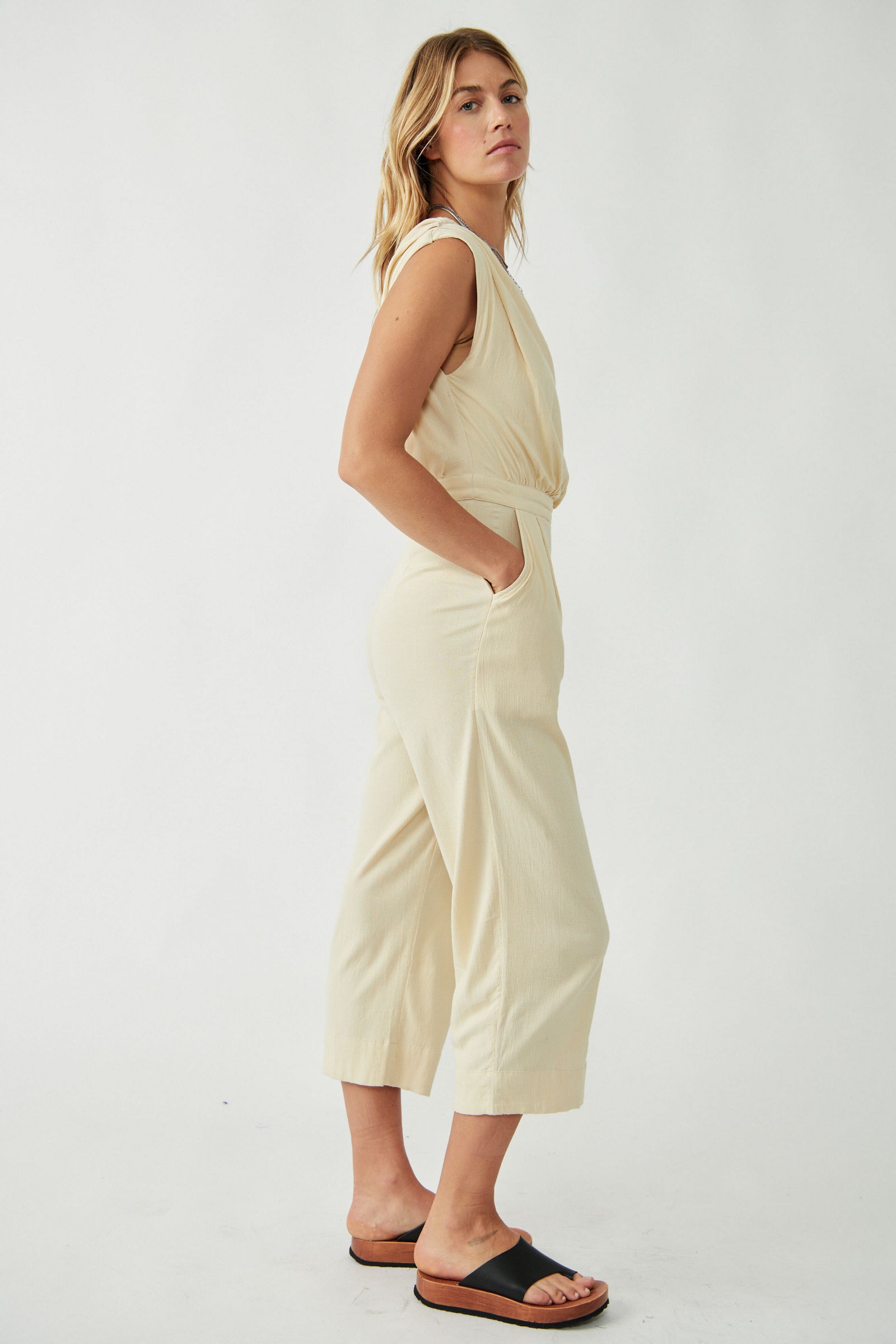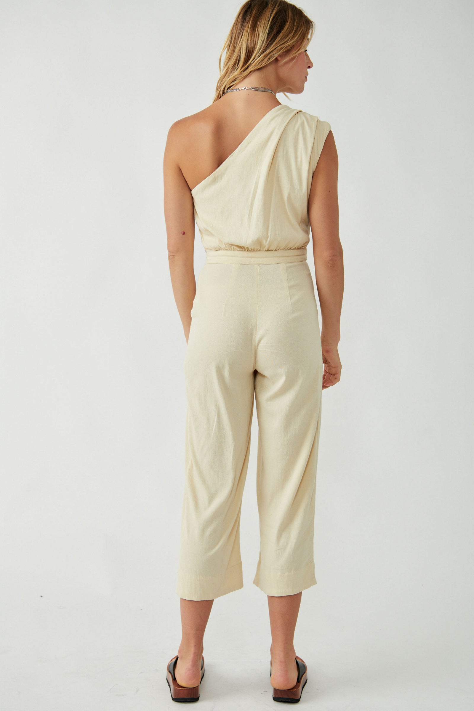 Features: One-shoulder style, draping at top, darting at pant, defined waist, side pockets, cropped at the natural ankle