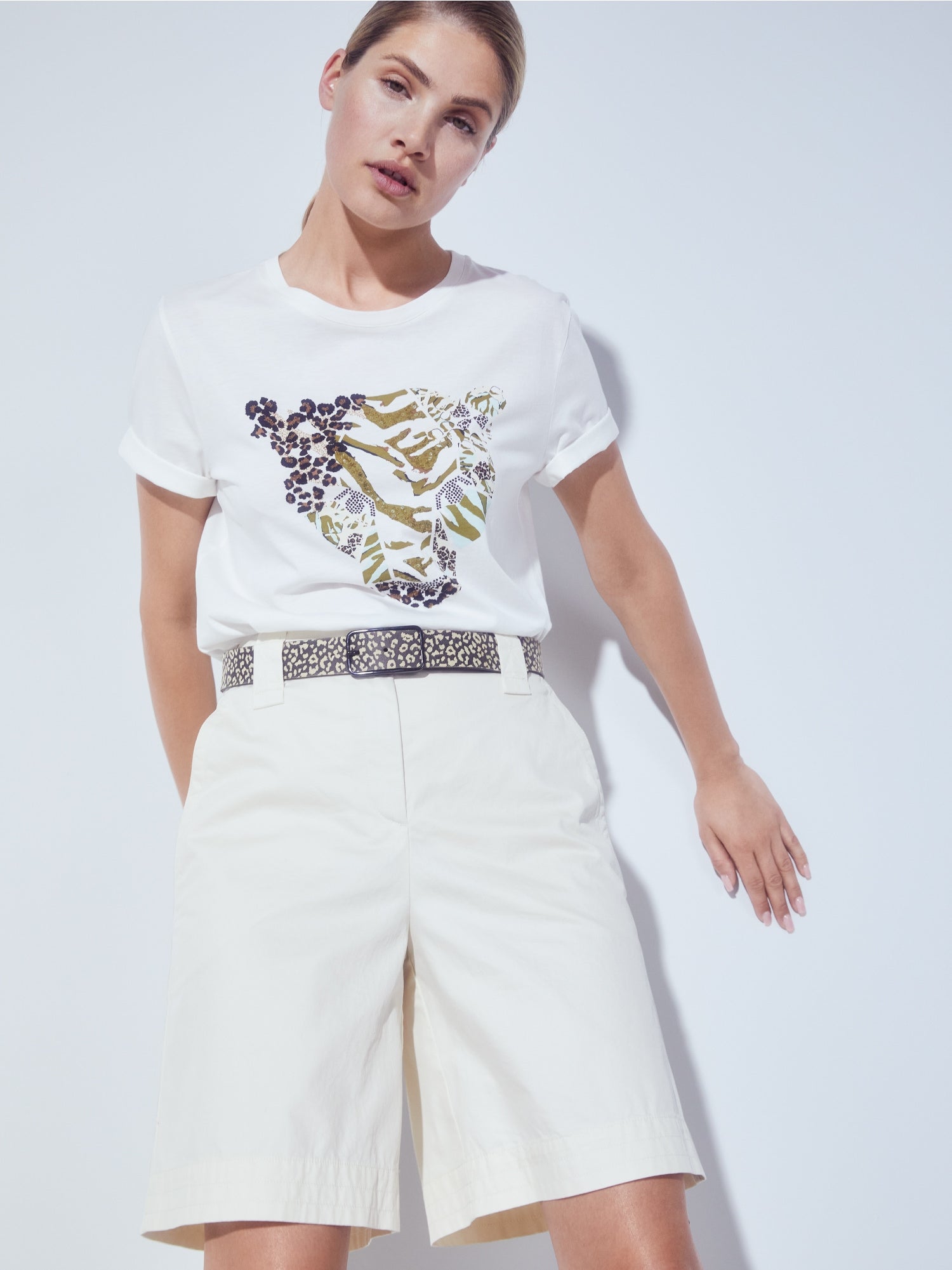 Shorts in a classic colourway with a matt sheen finish. The combination of a slim-fitting waist and wide legs highlights the feminine silhouette. The back of the waistband is elasticated and the looseness of the legs is set off by topstitching on the hems. The pants have two inset pockets on the front and two welt pockets at the back.