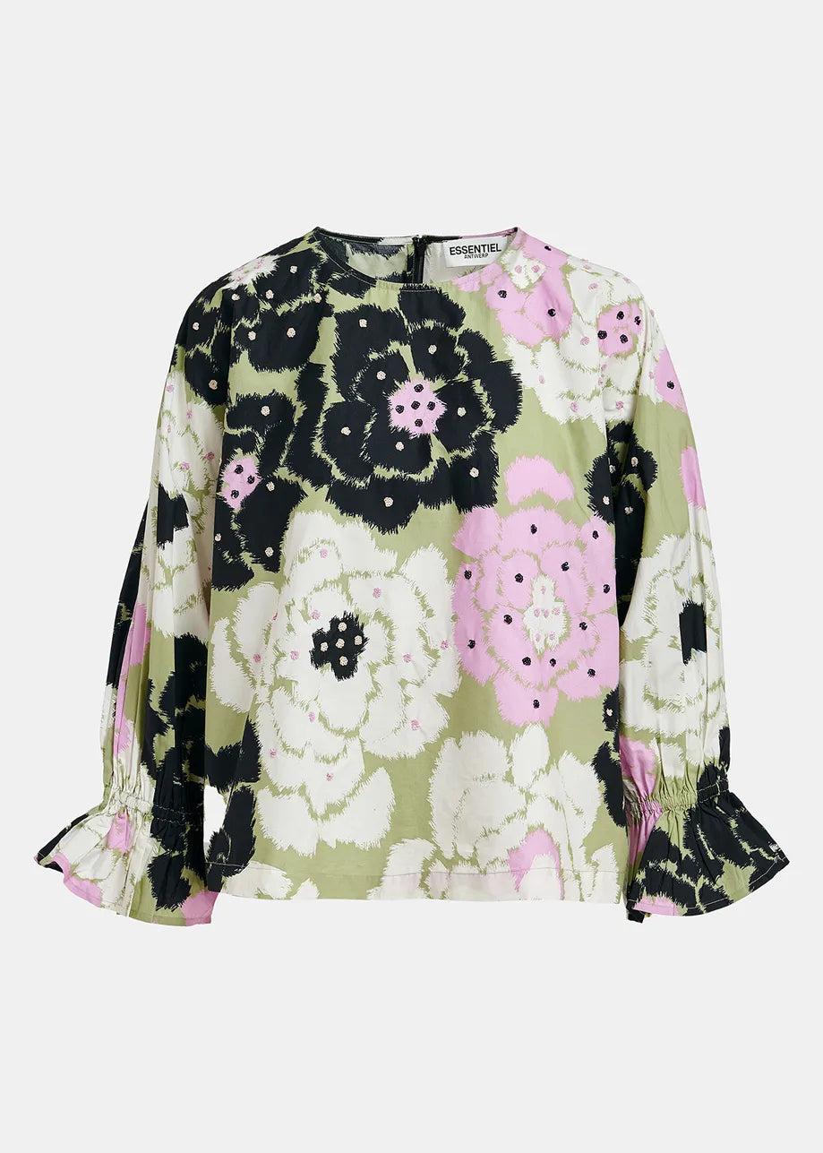 Essentiel Antwerp Fulberry Khaki, lilac and off-white top with puffed sleeves