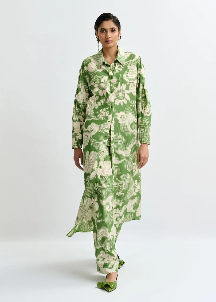 Floral-print shirt dress is designed for a relaxed silhouette, it features softly dropped shoulders, a fluid rounded hem and a matching self-fabric belt that lets you define the waist as you wish. Buttoned through the front with classic pocket flaps at the chest.