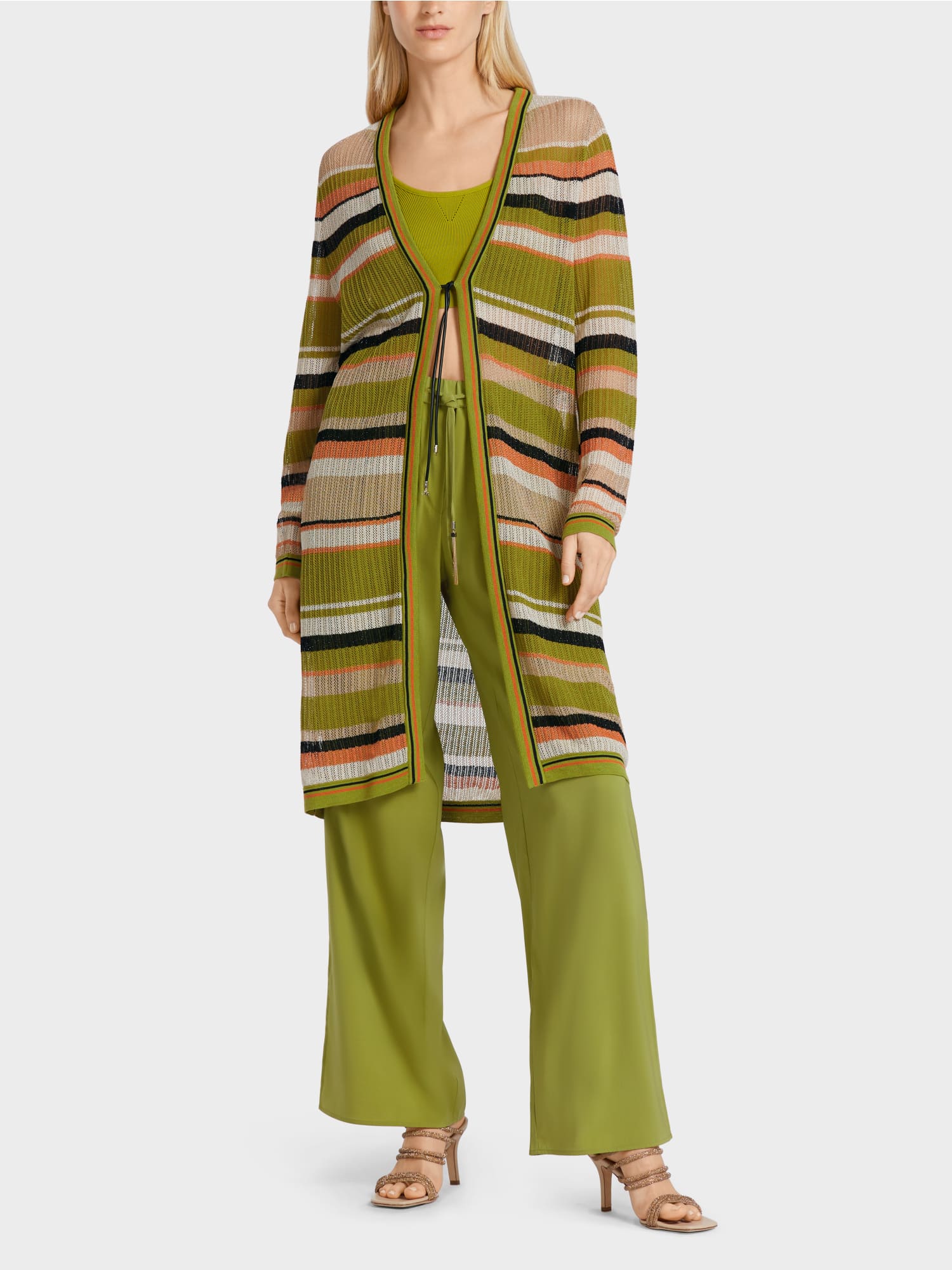 The cardigan is knitted in fine open work, making it light and airy to wear. It is fastened with a leather-effect band. The garment bears the “Rethink Together” sustainability label. It is also “Knitted in Germany”. It is knitted and finished in Germany using the latest technology and the individual pieces such as the sleeves and front, etc. are sewn together at our European partner companies.